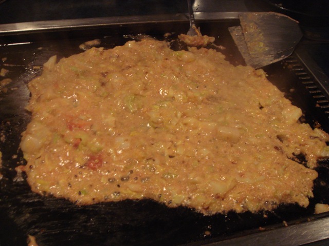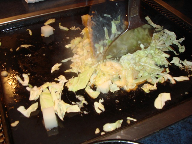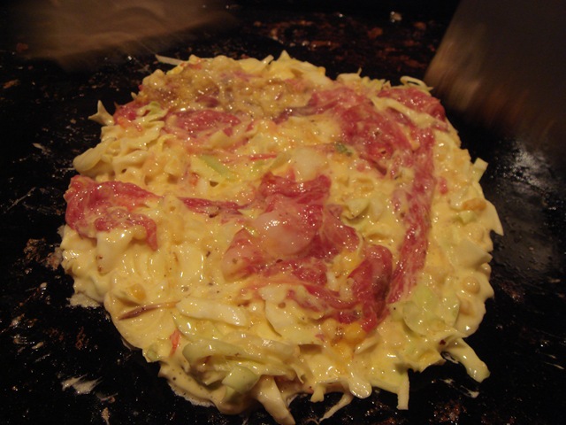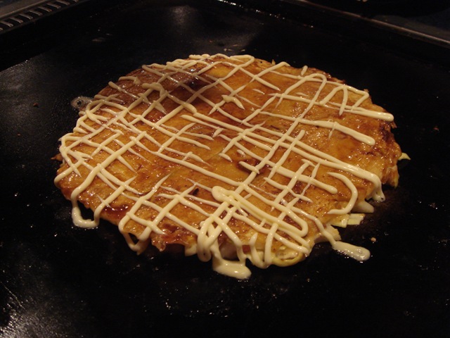 先把料都攪和在一起, 攤平煎, 之後翻面 淋上醬汁&美乃滋 就大功告成啦!