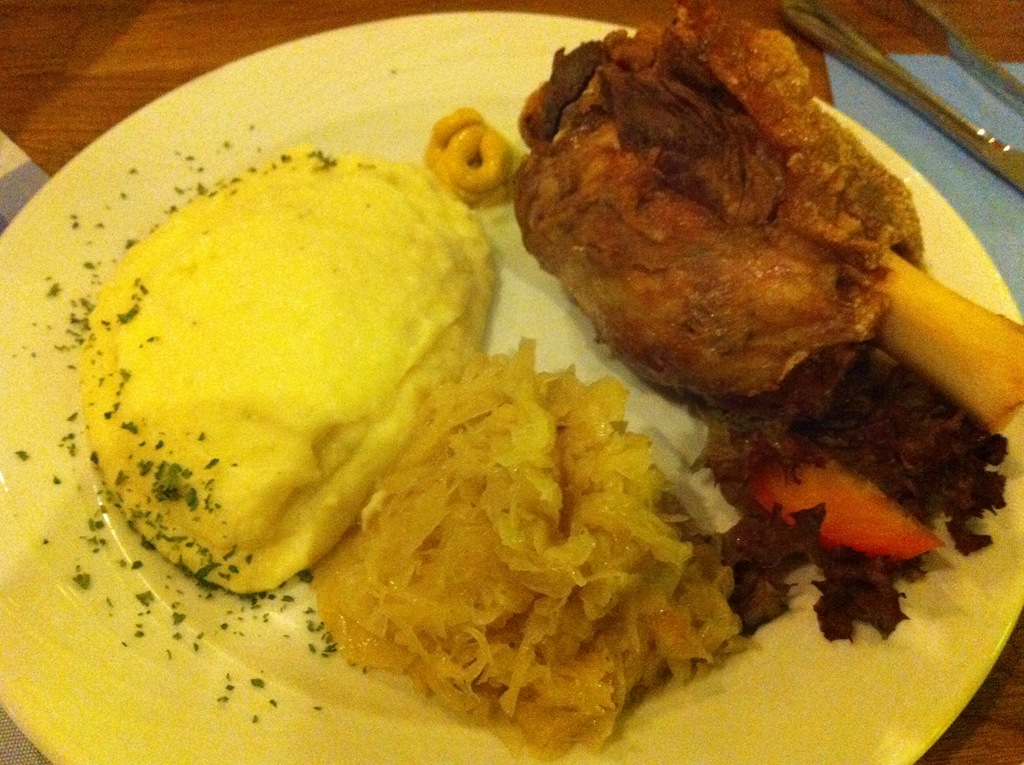 Haxe & Sauerkraut (脆皮豬腳&酸菜)13.5歐 (這家的豬腳外皮酥脆,酸菜"爛~~"的好~~~酸的恰到好處,口感很棒,很合我的口味,附餐的薯泥更是口感綿密,奶香味濃,好吃到不行~~)