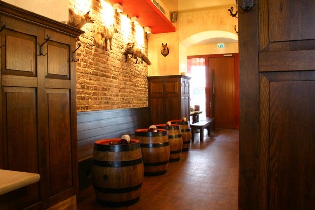 一進門有幾個用大啤酒桶當桌子的位置,桌面不大,只適合在這裡喝酒聊天的朋友,我們前後兩次到訪都是用餐,所以是安排到內部的座位去~~(其實就算是不嫌棄桌面太小想坐這兒用餐的話也是沒位置的啦~~~)