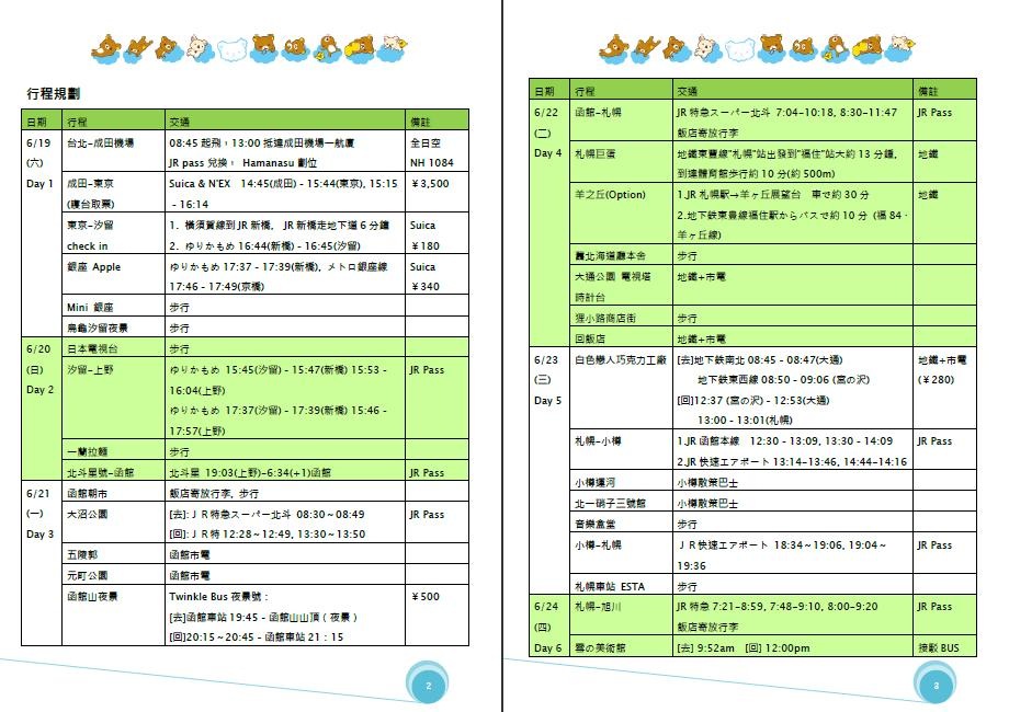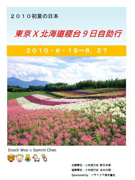 本次是旅行是由小米旅行社主辦(就是我本人啦~~),Sponsored by リラックマ株式會社,封面(請影印店挑一張厚一點且不掉色的紙) 都不忘放上幾位 リラックマ要角的icon,內頁也一定要有リラックマ與藍天白雲作伴。