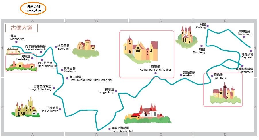 短短的兩天租車行程,實在是開不了太遠,沒辦法殺到慕尼黑去參加德國著名的啤酒節(基本上也訂不到飯店啦~~),也沒辦法去參觀新舊天鵝堡,我研究了半天,選擇了古堡大道的3個重點城市,從法蘭克福出發,第一天往羅騰堡(古堡大道與羅曼蒂克大道相接點),路程約188km,再順道去拜訪紐倫堡,晚上住宿羅騰堡,第二天開往海德堡,路程約171km,晚上住宿海德堡,第三天早上直接殺到法蘭克福機場還車(85km)並搭機返台,這樣子的行程安排,連自己都覺得安排得很完美~~Smile with tongue out (下圖摘自奇摩旅遊)