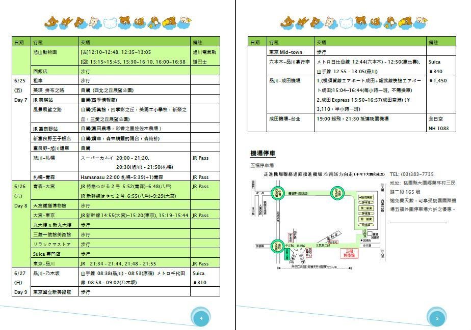 P.2~P.5 是每日詳細的行程規劃,包含已經預查好的列車時間及所需交通費用,p.5還有點空白處,就塞了張桃園機場停車位置圖。