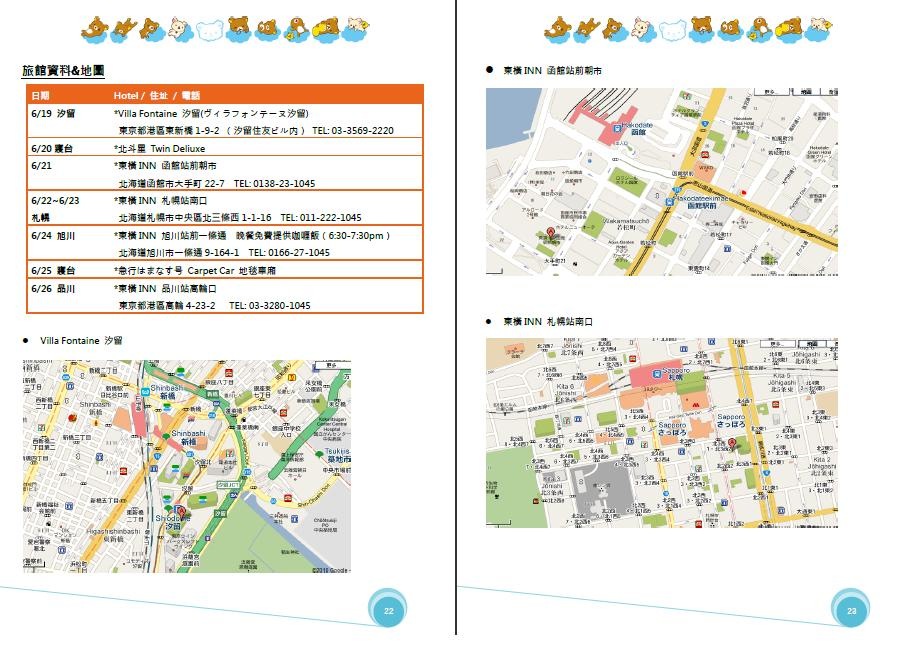 P.22-P.24是這幾天住宿飯店的預約資料及地圖。這邊要提醒大家,我太天才的印了Google map的地圖,結果在札幌的時候因為沒辦法辨識週邊的建築物,所以有一點小迷路,這是下回要改進的地方 (最後我把所有東橫Inn各分店的小卡都貼上去,下次絕對不會走錯,嘻嘻)。