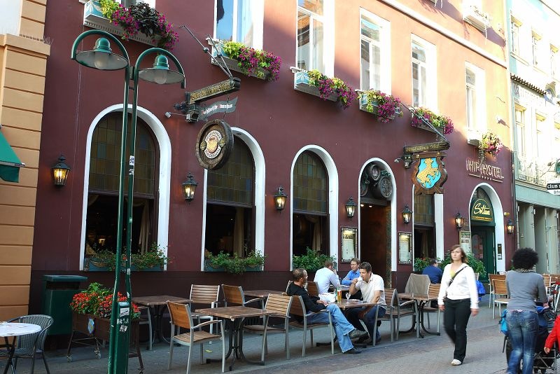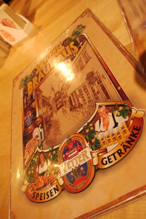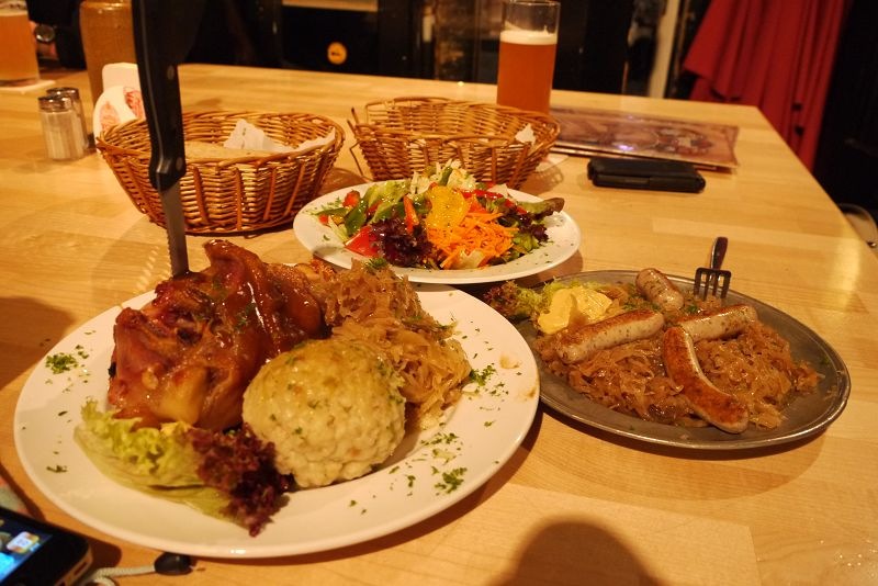 天色也漸漸暗了,晚餐一樣是鎖定豬腳大餐。入選的餐廳叫做Alt Heidelberger Brauhaus(網頁都是德文阿~~~暈),我們點了豬腳、德國香腸、沙拉,及一杯啤酒,這一桌共28.5歐。