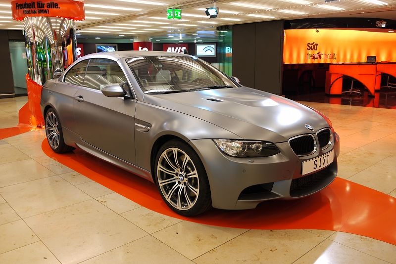 下圖是Sixt的放在機場的廣告車,左邊那台亮晶晶的十分吸睛,但走近一看發現是貼皮的,右邊的是消光版本。希望有機會再來的時候,可以租到BMW過過癮。