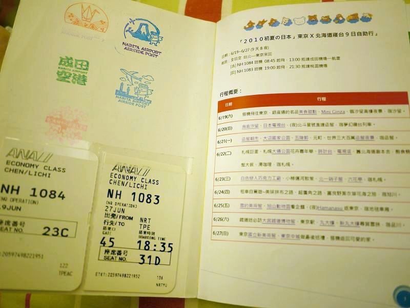 打開P.1,是行程的摘要檔,封面內頁也貼上了機票存根及蓋上成田空港的戳記。