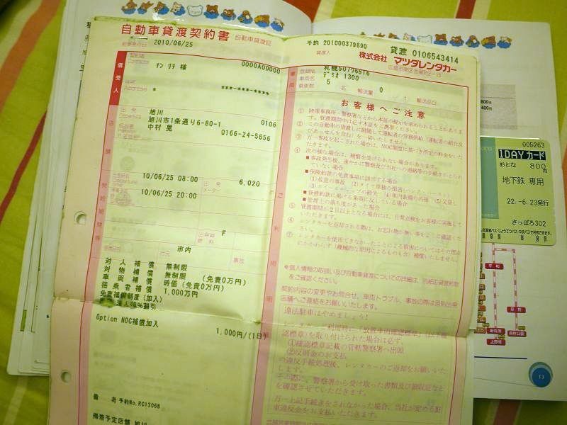 租車資訊(使用後),各位看到的是我事後把租車的契約書跟駕照的日文譯本都黏上去了,右側還隱藏了一張札幌地下鐵一日券。