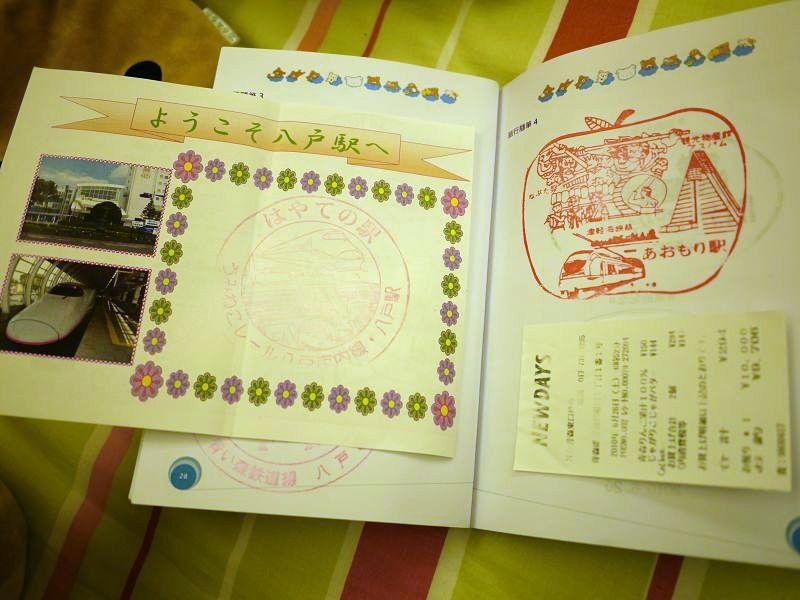 雖然八戶站有特別提供蓋戳記的紙張,也被我黏上去了。(右側的青森站戳記真是有特色阿~~)