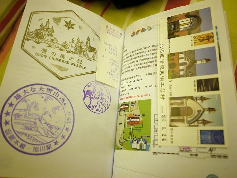 旭川-雪的美術館,特殊的紀念戳章及入場票券(黏貼在右側)。