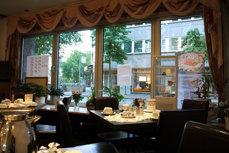 德國跟台灣時間差18hrs,適應起來並沒有甚麼太大問題,早餐是一天活力的來源,飯店一樓的餐廳窗外景色不錯,時常有路面電車經過。