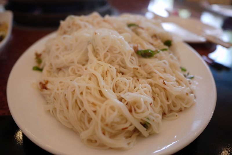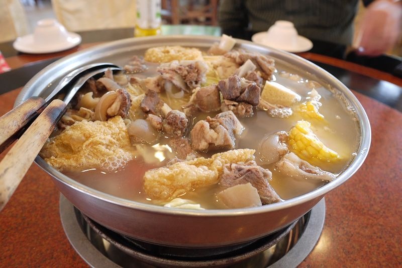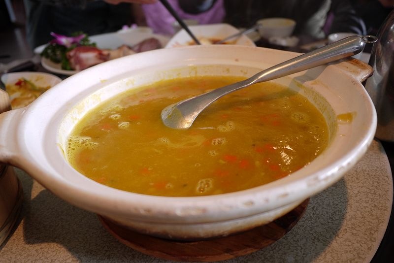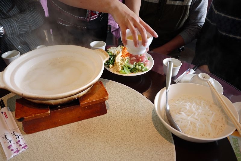 首先上場的是過橋米線,分三部分上場,配料、米線、高湯,服務生幫忙先把蛋汁倒入滾燙的湯中,再將豬肉放入,接著是其他的配料及米線,馬上就變成香噴噴的過橋米線,這湯頭實在是太讚,到現在都還回味無窮呢!