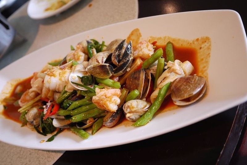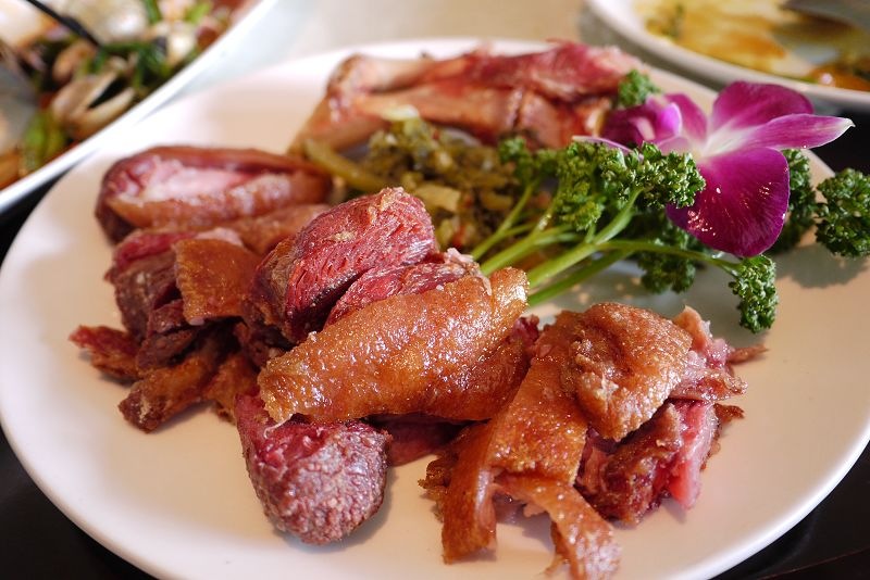 繼續上的是 辣炒海鮮和豬腳,這道海鮮就稍稍辣了一點點,同事認為是熱炒的關係,等到涼了之後就不覺得太辣了,除了海鮮之外,我特別喜歡裡面的四季豆。而豬腳,則是頗令我意外的一道菜,德國豬腳搭配雲南酸菜,豬腳上有花生粉的香氣,我很喜歡,尤其是有肥油的地方~~嘻嘻!!