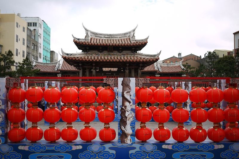 最後走到龍山寺,這也是間很歷史的寺廟。門口放滿了花燈,上面都是燈謎,隨便看了一題,覺得好難。兔子,猜台灣地名。
