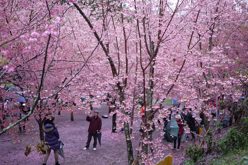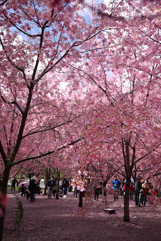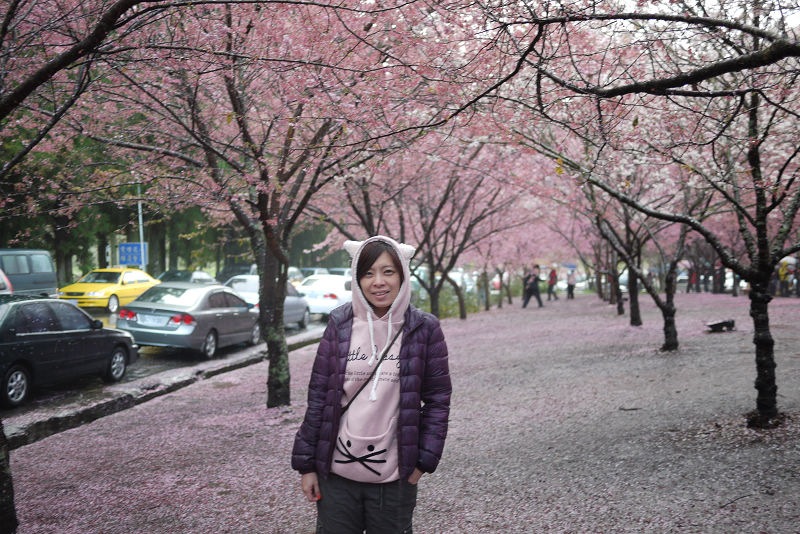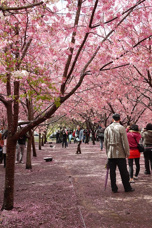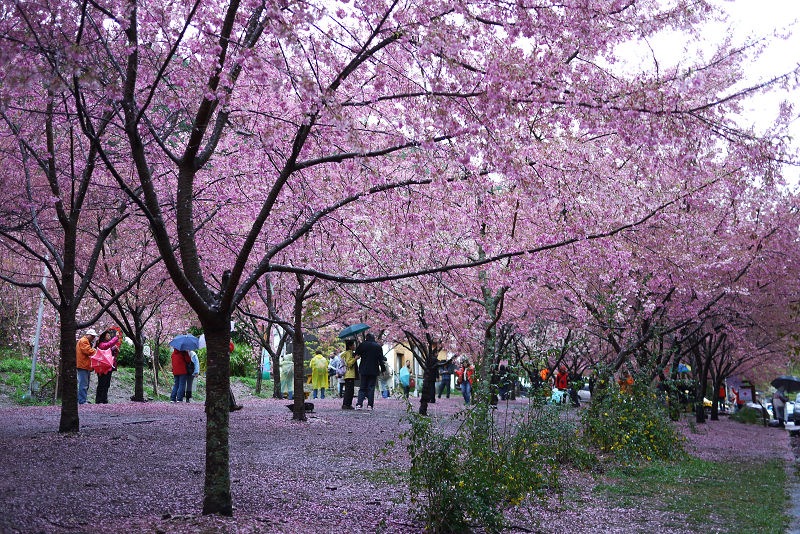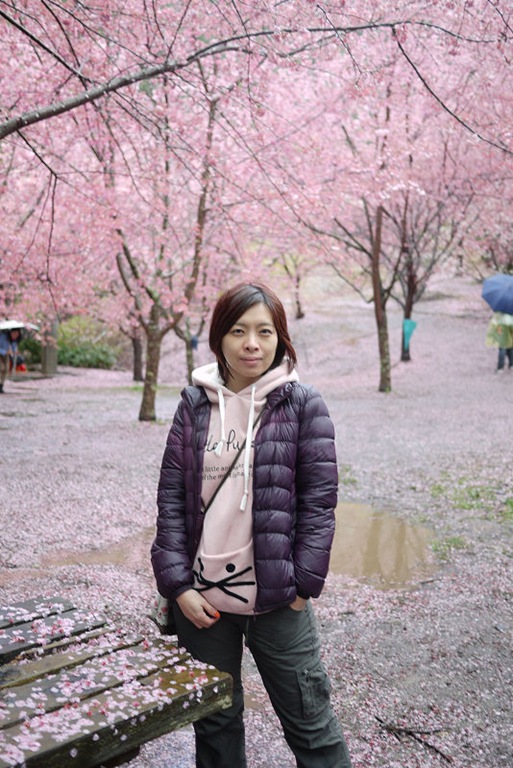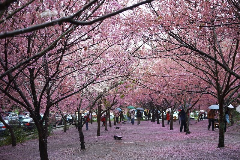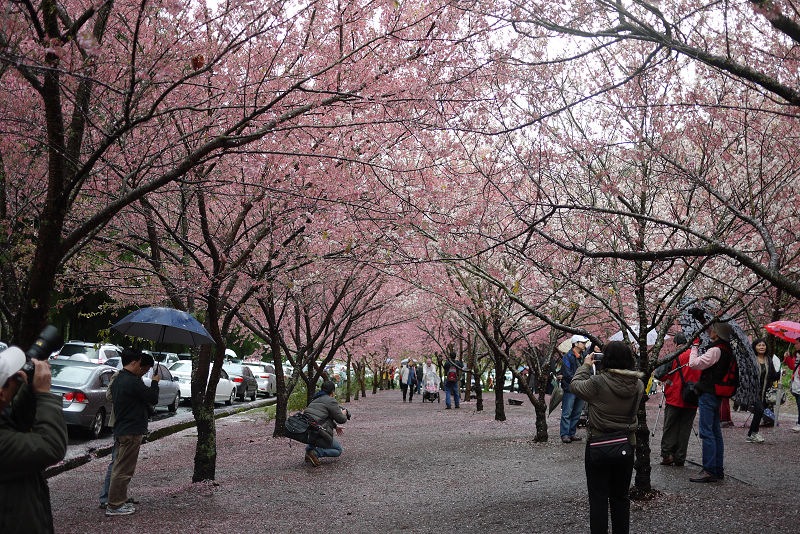 首先來到生態園及七家文化遺址區,這裡就是最夢幻的櫻花林了,下著雨,地上濕濕的,大家都撐著傘,許多攝影人還準備著腳架,等待美景的那一瞬間,按下快門。