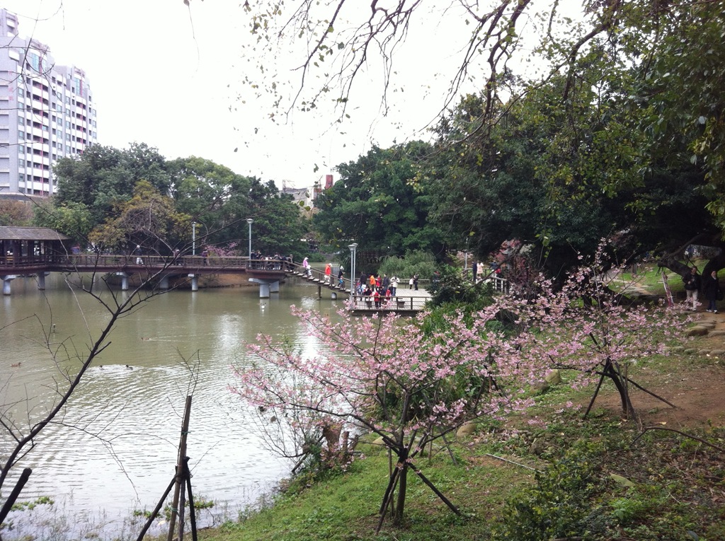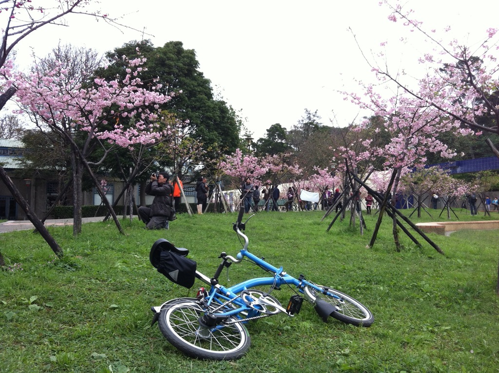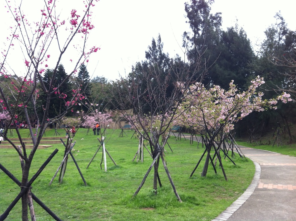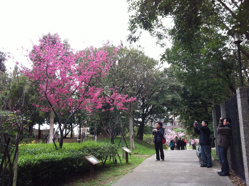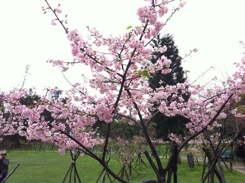 首先來到生態園及七家文化遺址區,這裡就是最夢幻的櫻花林了,下著雨,地上濕濕的,大家都撐著傘,許多攝影人還準備著腳架,等待美景的那一瞬間,按下快門。