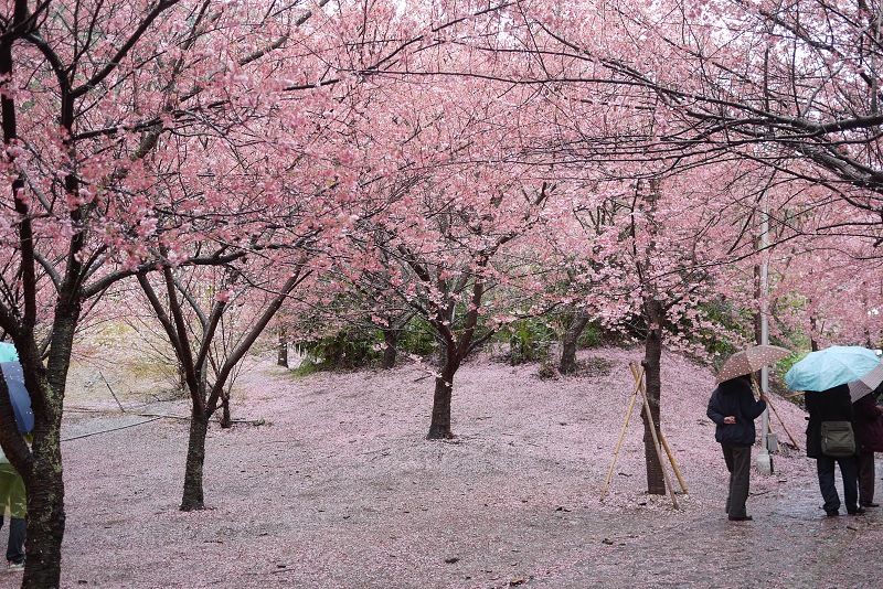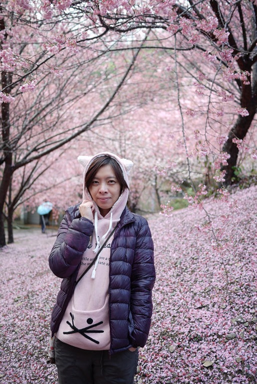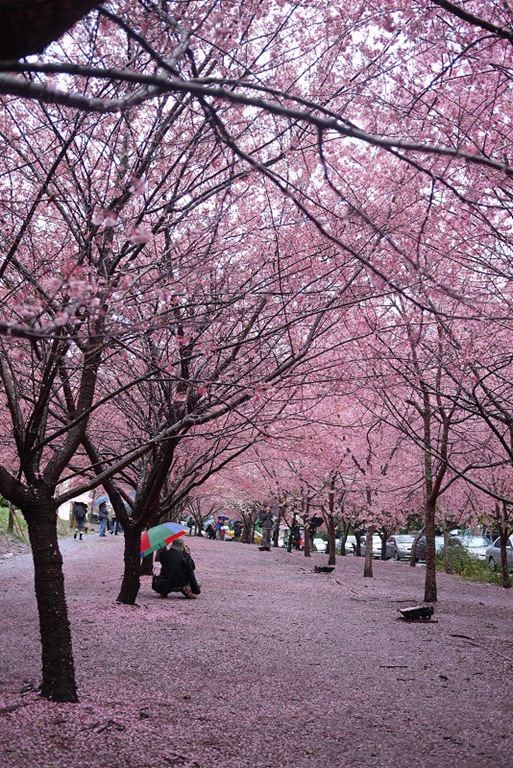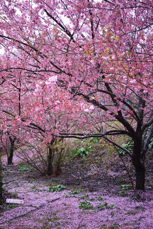 地上滿是櫻花花瓣,造成了粉紅一片的美景,一邊下著雨,也讓這片櫻花林更顯得"濕"情畫意~~