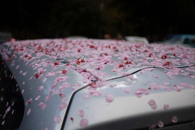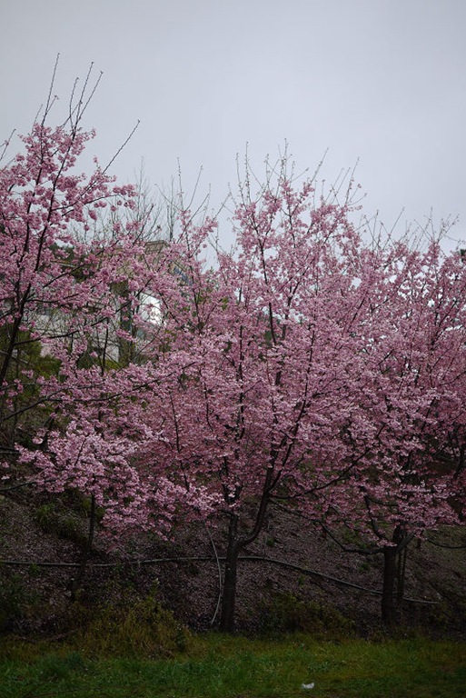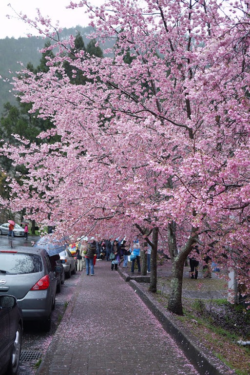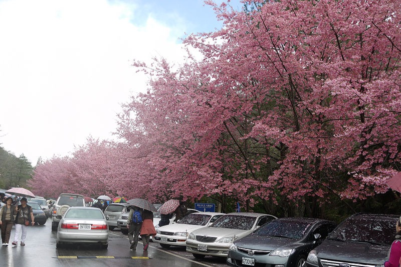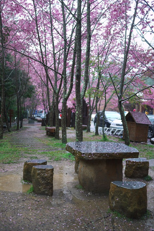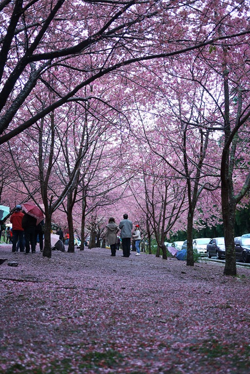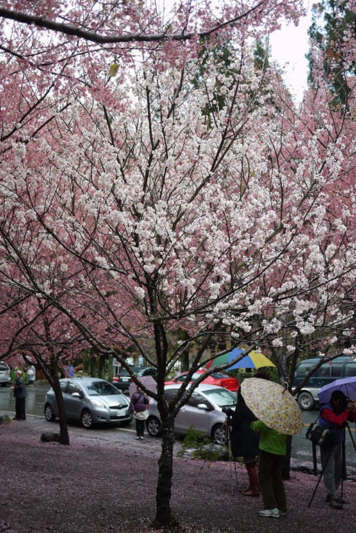 才半夜三點多,園區車輛已經很多,隨便找了個地方停,可惜沒停到櫻花樹下,不然車頂就可以佈滿著美麗的櫻花花瓣。在車上睡著等天亮,雨勢忽大忽小,輾轉難眠,天亮後雖然持續下著小雨,但園區內已經人聲鼎沸,七點了,該去拍花了。