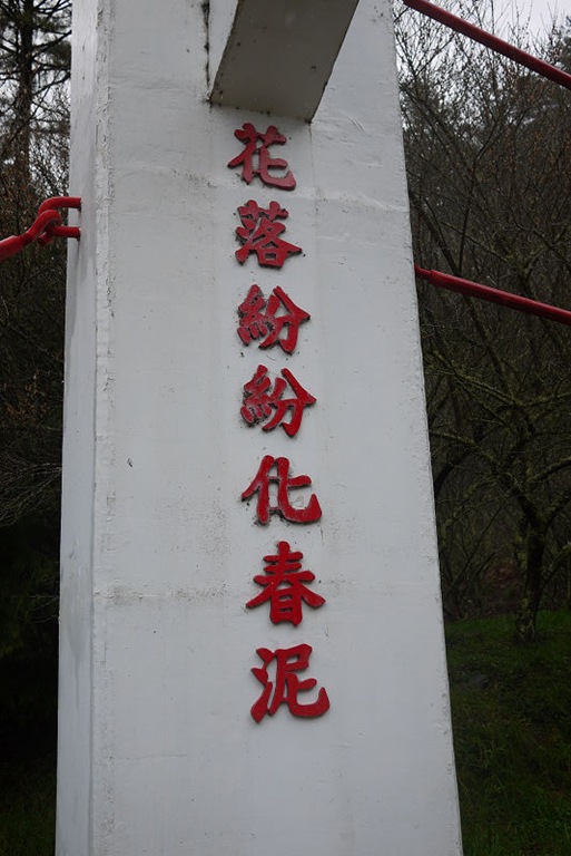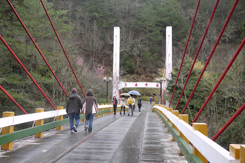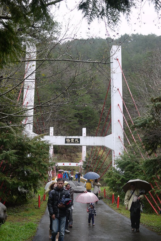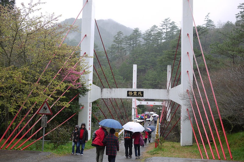 右轉往兆豐橋,可通往茶莊文物館,但雨勢變大了,只好折返。底下就是七家灣溪,溪水湍急,看不到櫻花鉤吻鮭。