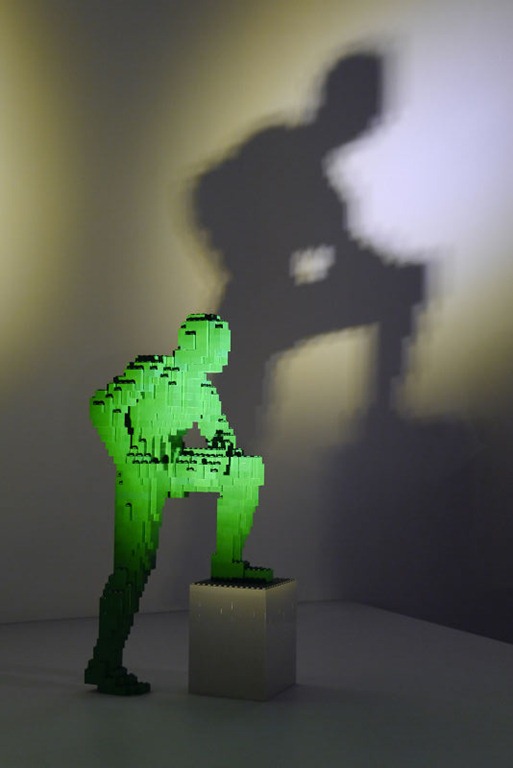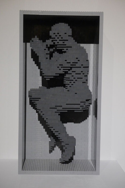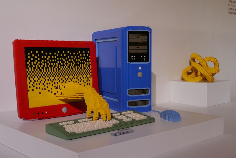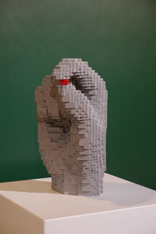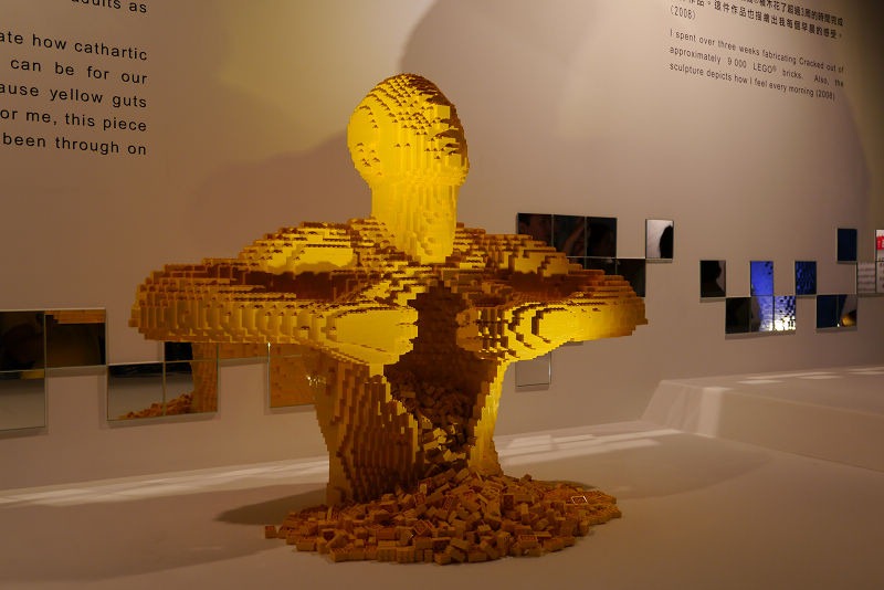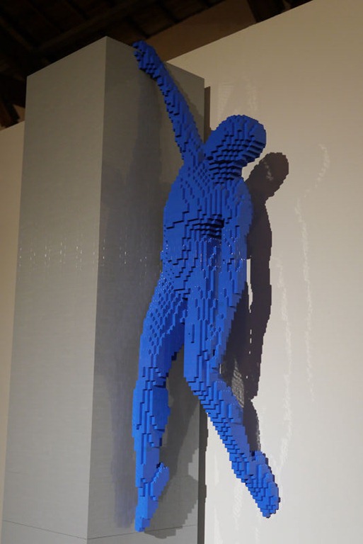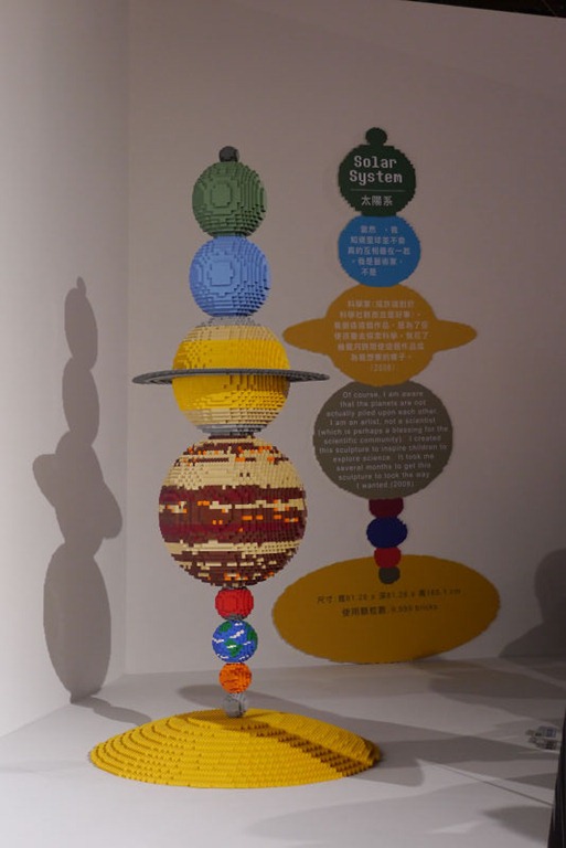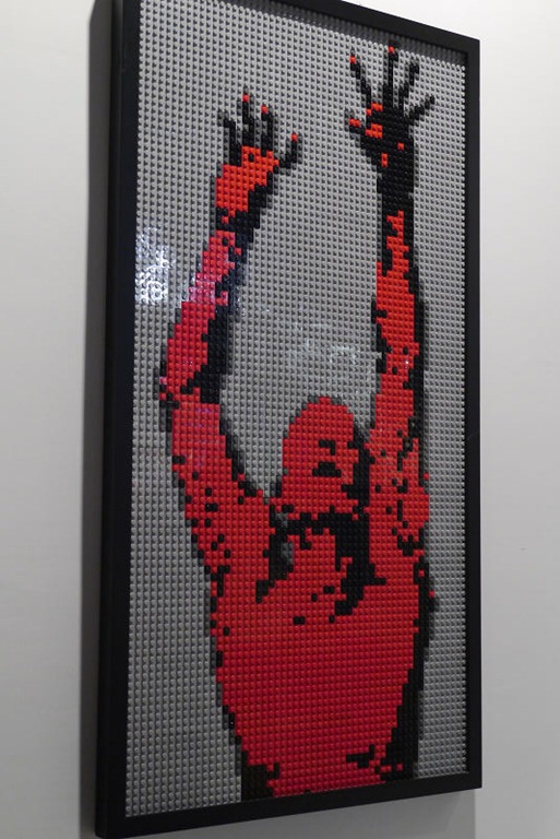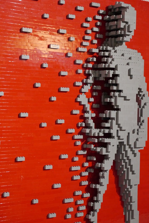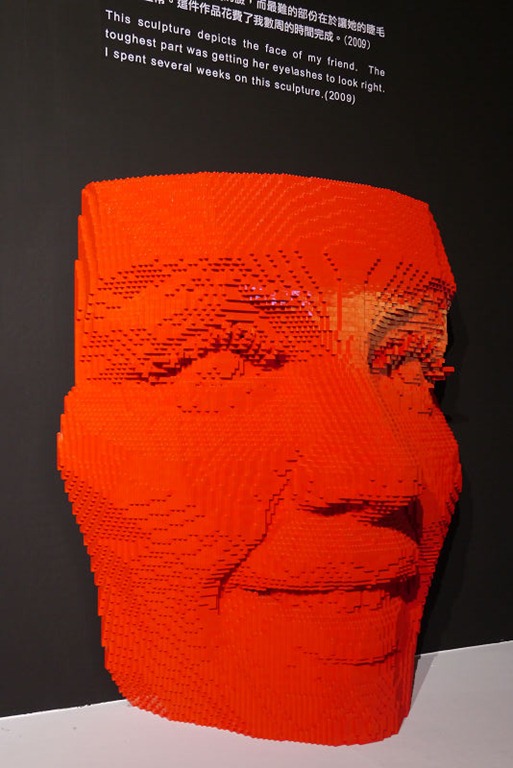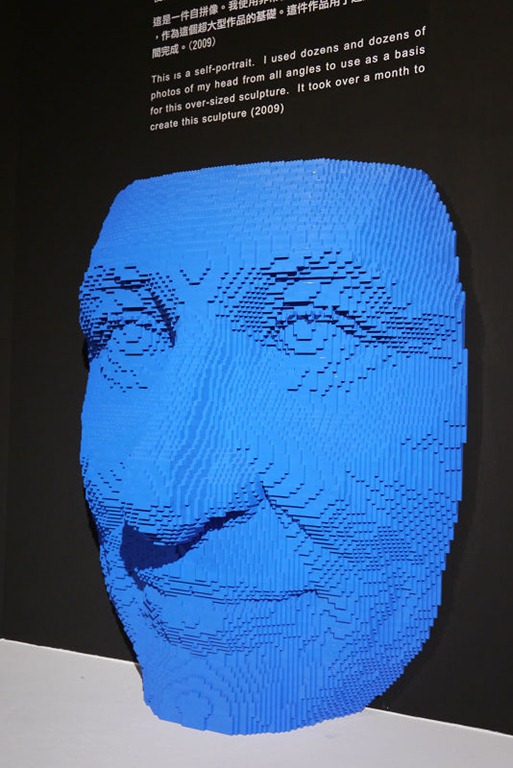 我喜歡樂高,主要是那些可愛的人物,還有搭配各個強檔電影所製作的相關場景、建築、交通工具等等,尤其是電動化之後,更是活靈活現。不過這個展覽,還真的顛覆了我對樂高的想像。展覽展的不是超大型的樂高場景,而是用單一尺寸,相同顏色,或簡單幾種顏色組合,所做出的巨幅作品,每一個作品都要花費好幾天、甚至好幾個星期、或好幾個月的時間,所需要的樂高積木,也高達數千到上萬個。