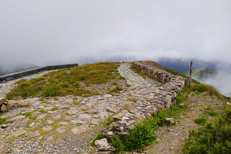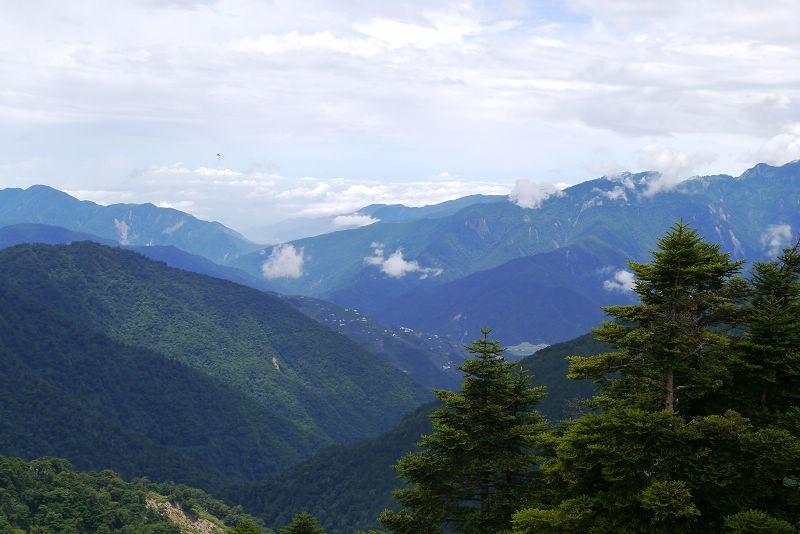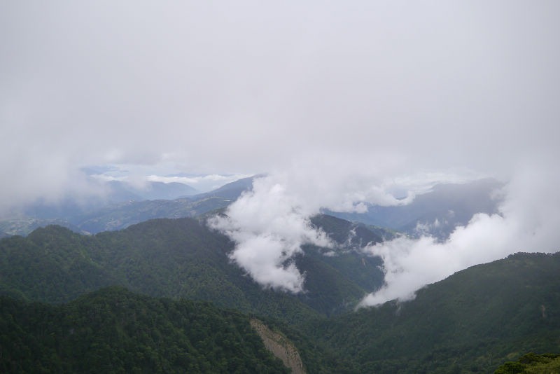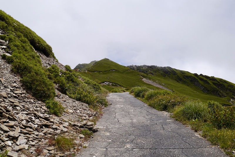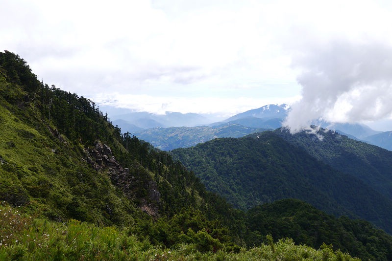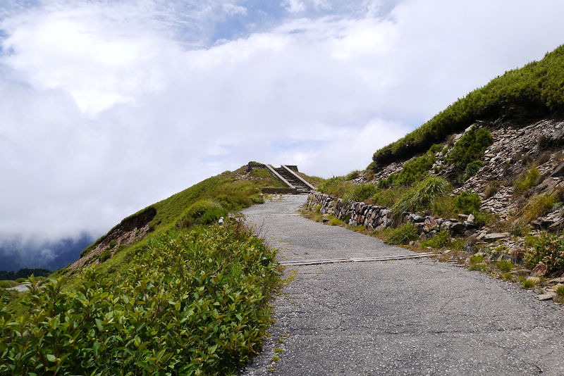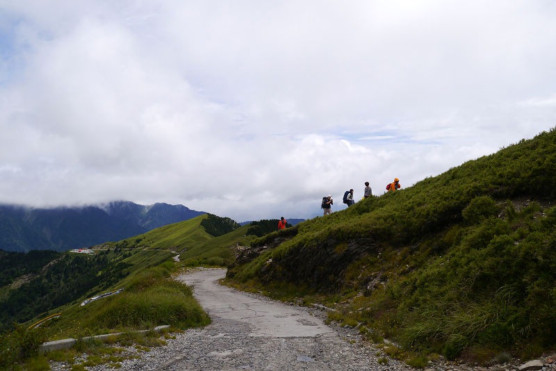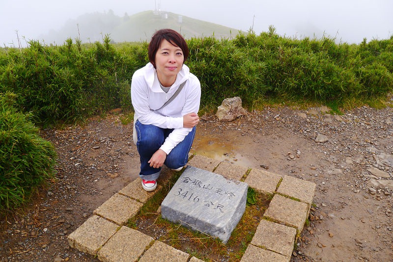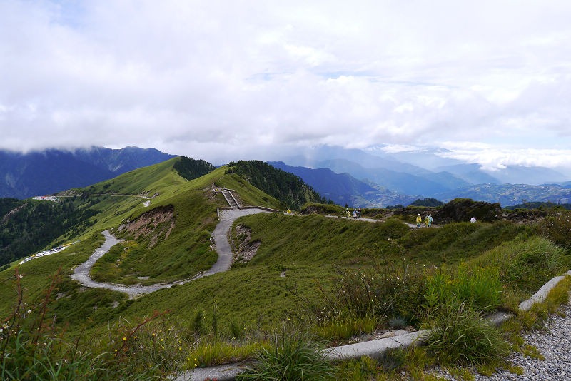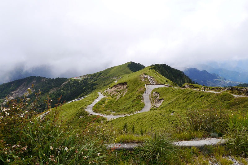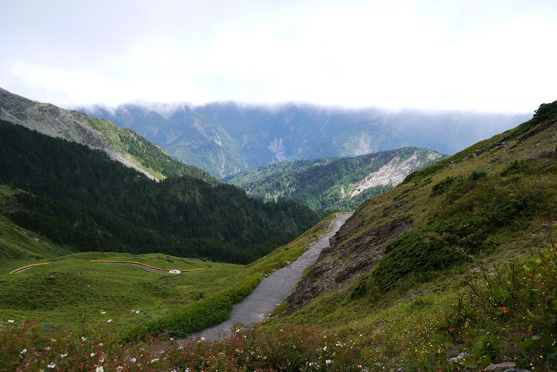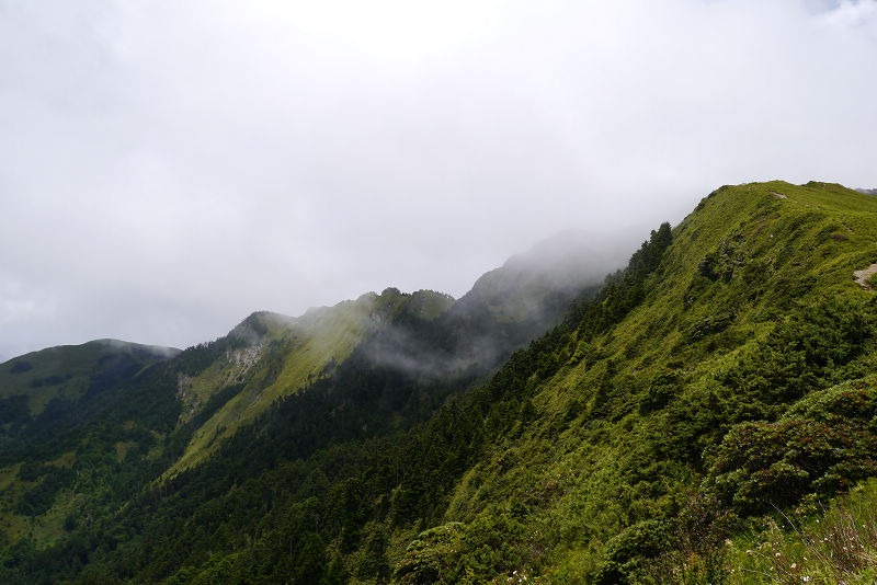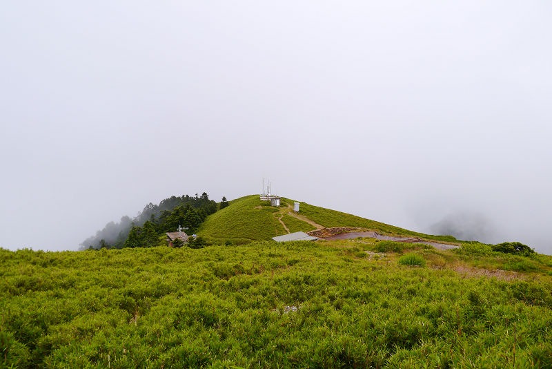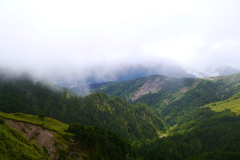 往合歡山主峰登山口看去,這是經典的畫面,我朝思暮想的地方。山中天氣真的是瞬息萬變,沒一會兒的時間,滿是雲霧,又過了一下,雲霧散去又露出翠綠的山色。