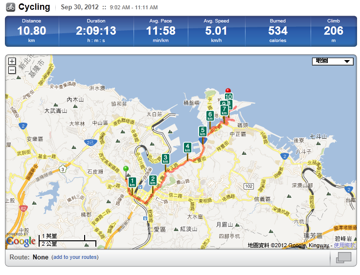 這陣子Run Keeper有點秀逗,這一趟的回程沒記錄到,總之從我家騎車到和平島也才不過10km的路程。