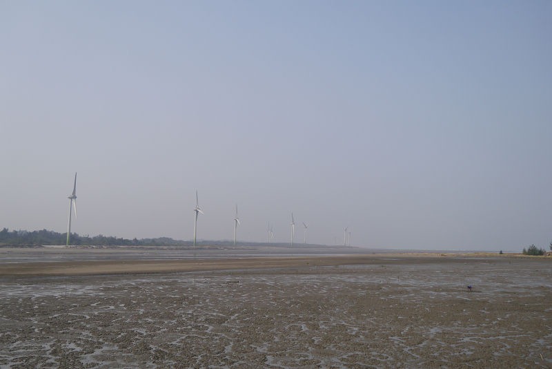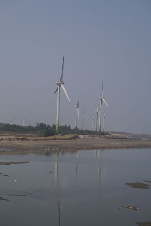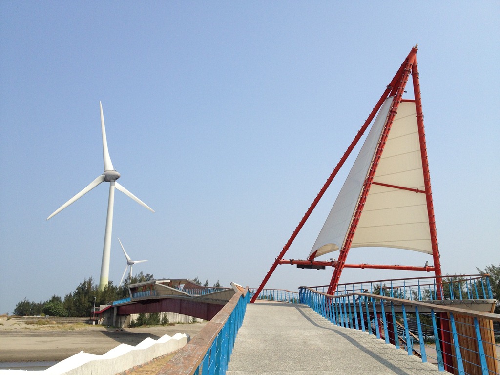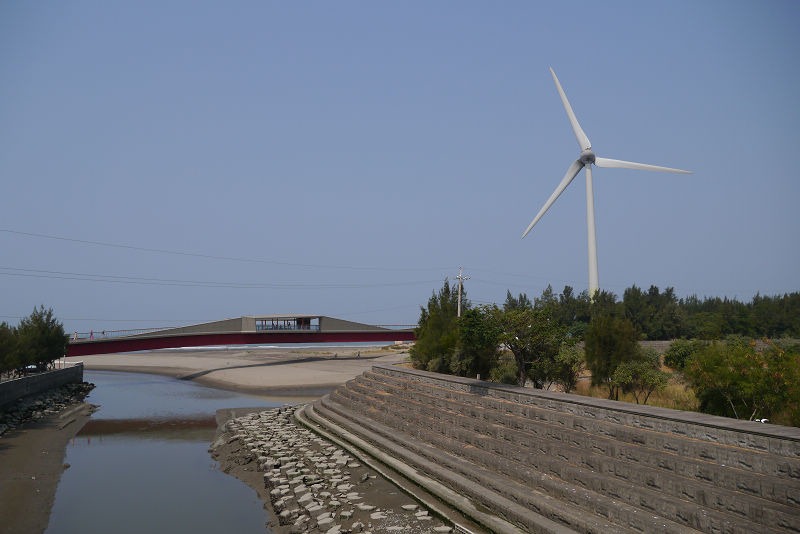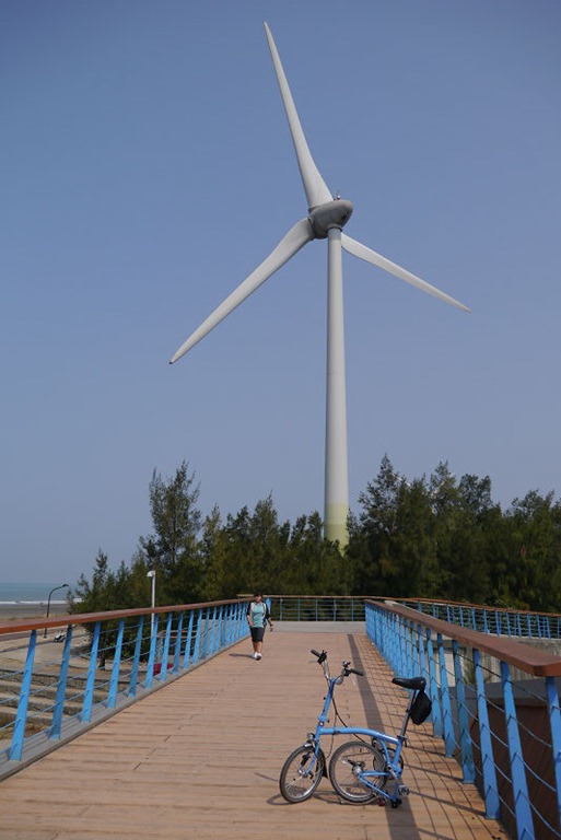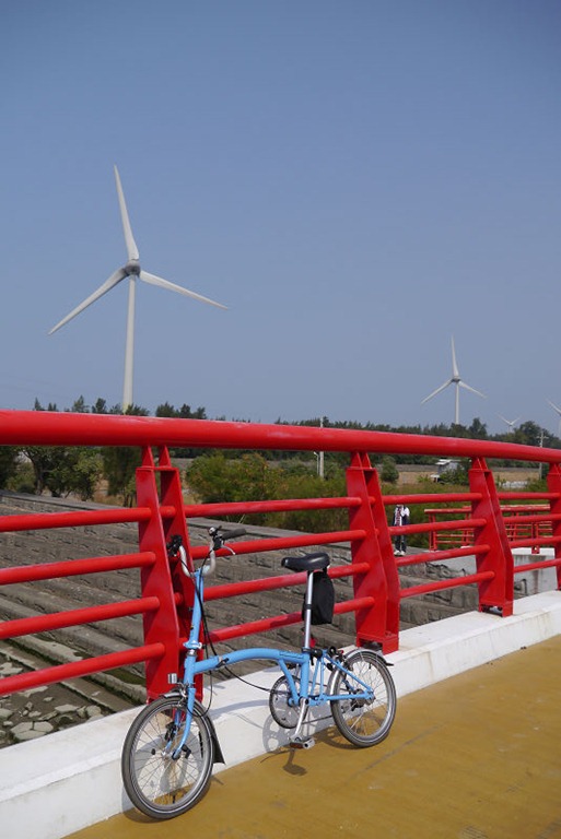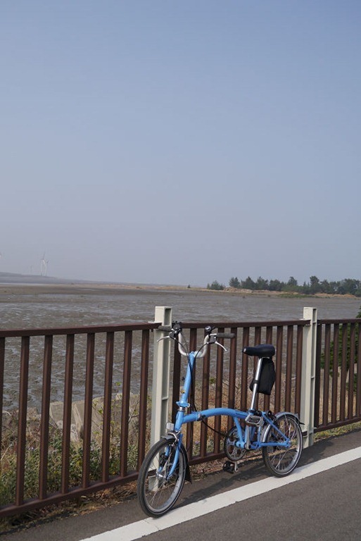 沿途果真十分涼爽,在樹林裏面騎車,有點小坡度上下,不一下子就騎到了五福大橋,中港溪出海口,正逢退潮,對岸整排的大風車,跟高美濕地的感覺有一點點像。