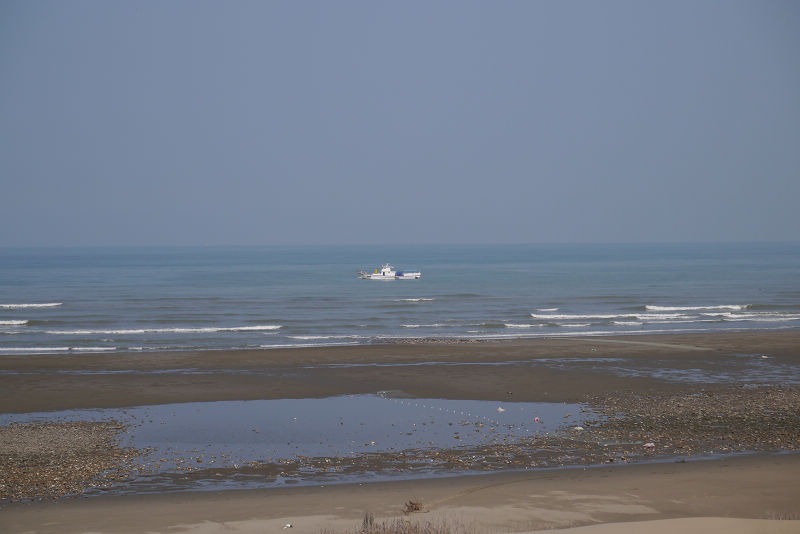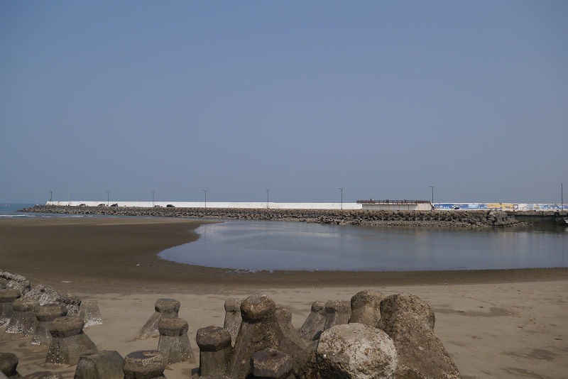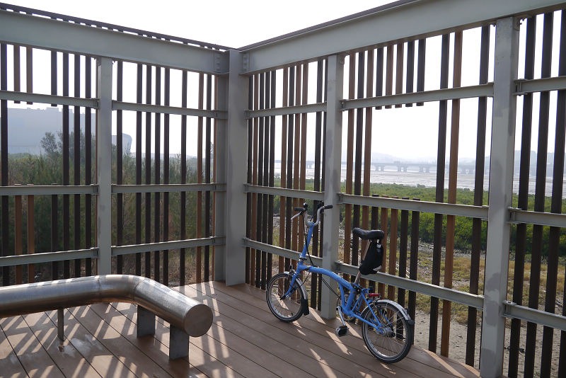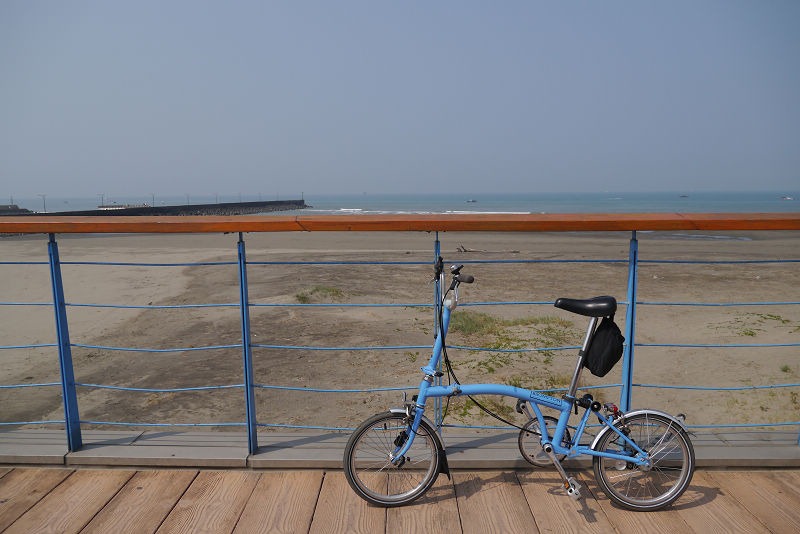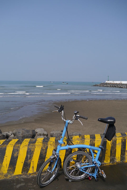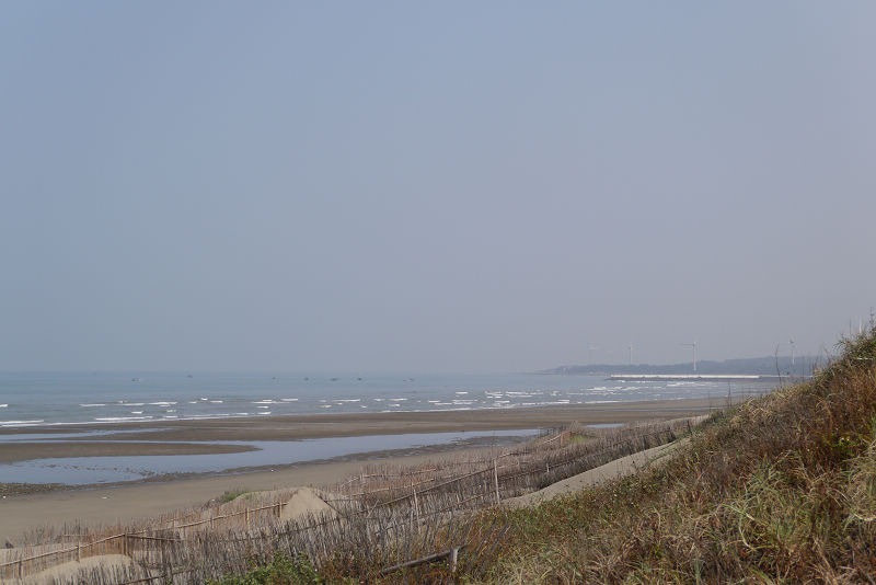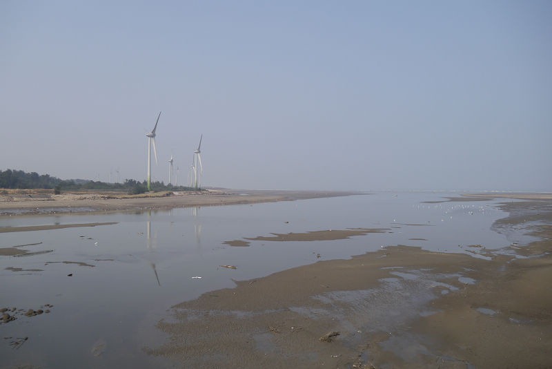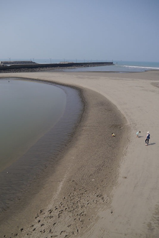 沿途果真十分涼爽,在樹林裏面騎車,有點小坡度上下,不一下子就騎到了五福大橋,中港溪出海口,正逢退潮,對岸整排的大風車,跟高美濕地的感覺有一點點像。