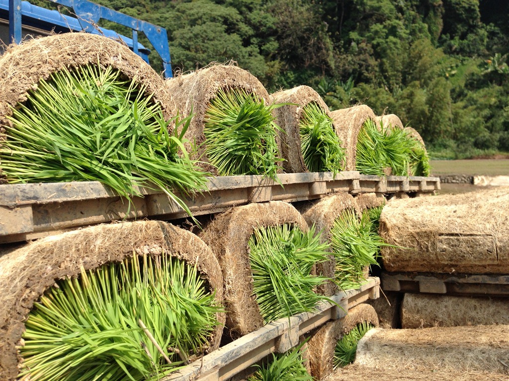 插秧機在田裡工作著,一堆堆的秧苗正等著埋入田裡。