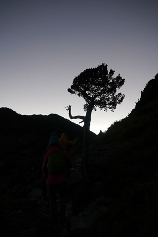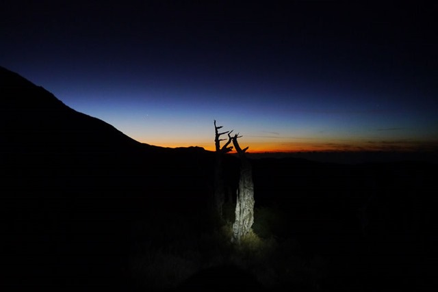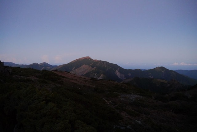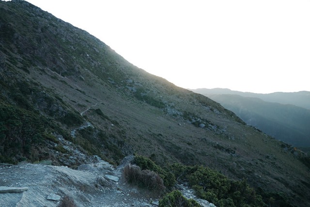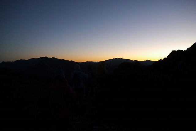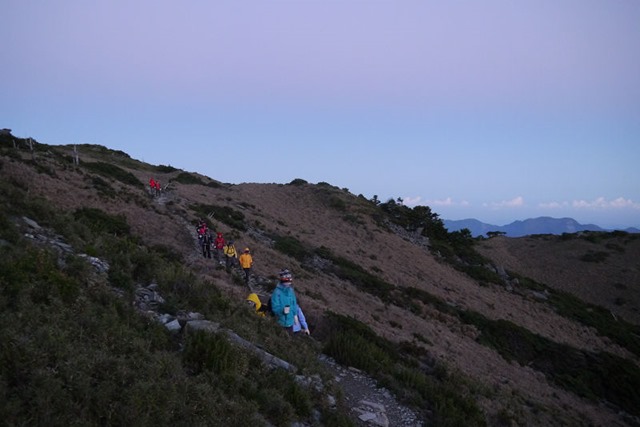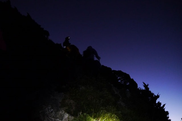 第二天的路程就比較遠了,天氣還不錯,沒辦法到嘉明湖,至少也要收服一座百岳。向陽山,這天的目的地,一點多起床吃早餐,然後就整裝出發,戴上了頭燈,一個接著前一個同伴的腳步,緩慢地往上爬。向陽山的標高3,603m,離山屋還有750m的高度要努力,希望能在日出前登頂。