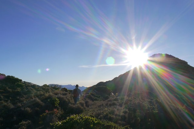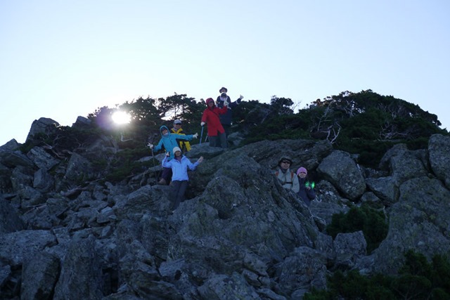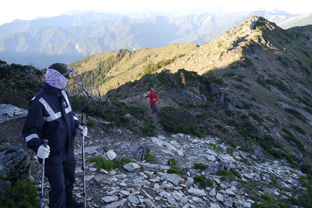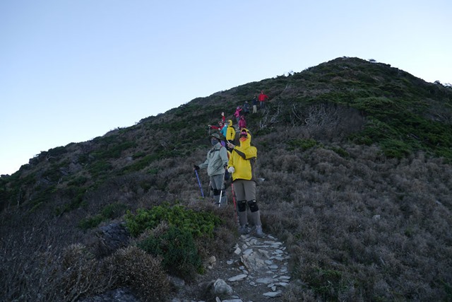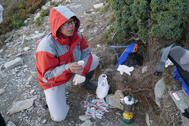太陽公公既然都上工了,領隊說不如先煮個咖啡,暖暖身子吧~~喝完之後把把包包丟在路邊,輕裝攻頂去。