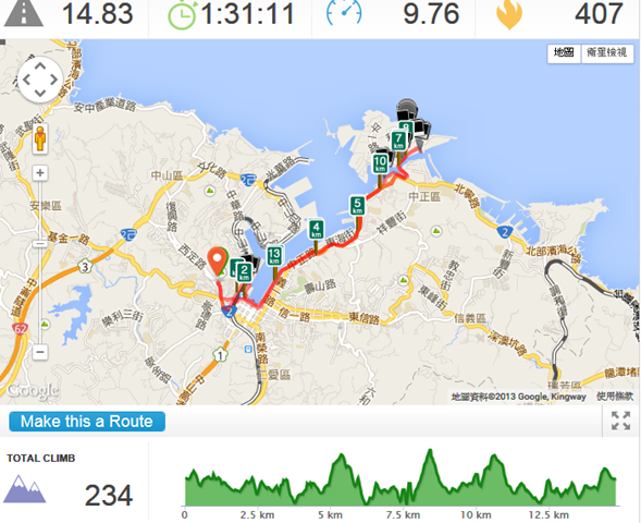 一樣使用Runkeeper紀錄,今天的路程14.83km,燃燒407大卡,不過晚上的火鍋大餐就又通通補回來了。