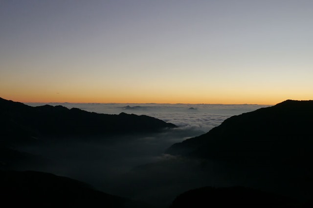 拍完晚上的雲海,車友繼續帶路往石門山登山口前進,這時候天邊已經露出一點光芒,我們加緊腳步,700M長的步道,因為空氣稀薄,走起來有點喘,偶爾停下來多吸幾口空氣,但懷著滿心的期待,只想著趕緊爬到山頂。