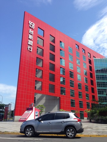 那要先上哪兒去試車呢? 第一個念頭就是開到河濱公園好好拍個照,沿途藍天白雲真是美麗,突然瞥見紅色的台新銀行大樓,趕忙先停下來,幫小獅王拍個定裝照。