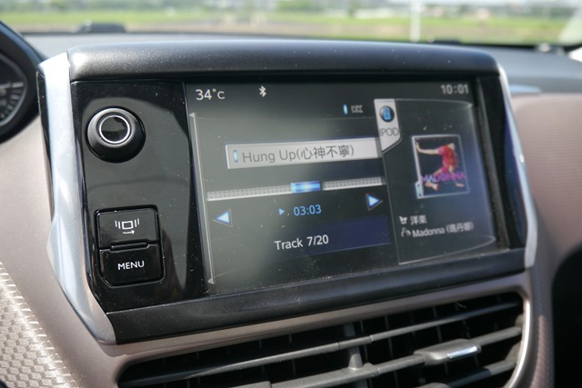 上車第一件事就是確認車上能不能用USB幫手機充電,是否有整合音響系統,結果當然是令人十分滿意,7吋全彩觸控式多媒體資訊螢幕,連播放中的專輯封面、歌曲名稱都可以正確顯示,車上共有6支喇叭,音響效果還不錯,方向盤上也有快速鍵可以操控,十分方便。(娜姊的腰力真好~)
