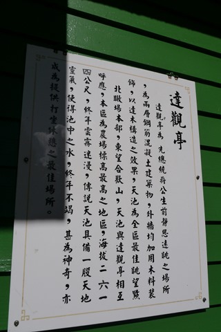 天池旁有個達觀亭,是蔣公來這裡沉思的地方,這邊的長春茶(現場喝50元一杯)挺好喝的,茶包10元,一盒200,買了一盒回家慢慢品嘗。