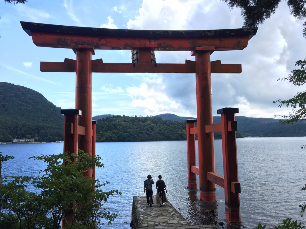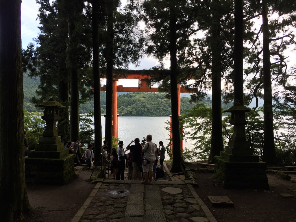 箱根神社因為這個在湖中的鳥居特別有名氣,穿過林蔭小道,約莫幾分鐘的路程,就看到鮮紅色的鳥居,走近才發現,鳥居旁整齊的排著隊伍等候拍照,大家都很有默契地幫前一組人拍照,依次傳承下去,多數都是情侶檔,我只有一個人,只好到旁邊玩沙……….不過也發現了一個拍照的好角度。