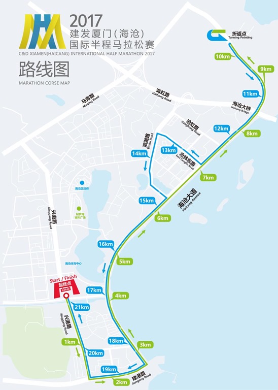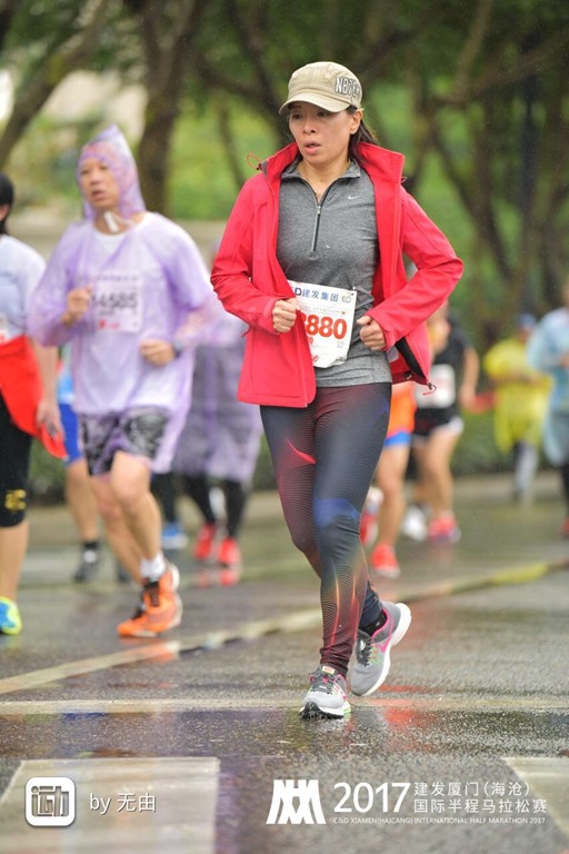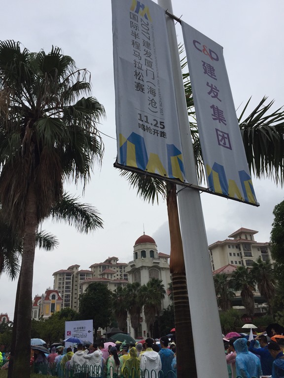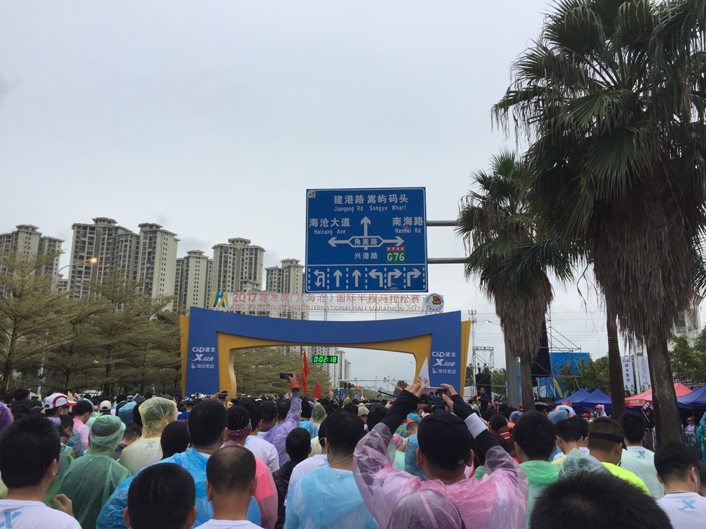在比賽的前兩周不小心感冒,除了上吐下瀉之外,鼻子也塞了好一陣子,因此荒廢(偷懶)了許久都沒練跑,日子到了也只好上戰場了,11/25這天可能是11月份以來最冷的一天了,加上已經二十多天沒下雨的廈門竟然下雨了,讓這天的半馬還沒出發就倍覺艱辛,更悲慘的是,我竟然聽信同事的話走了快五公里(當作暖身)去報到,撐著傘在雨中走沒多久鞋就濕了,更不用說差點還來不及check in………….