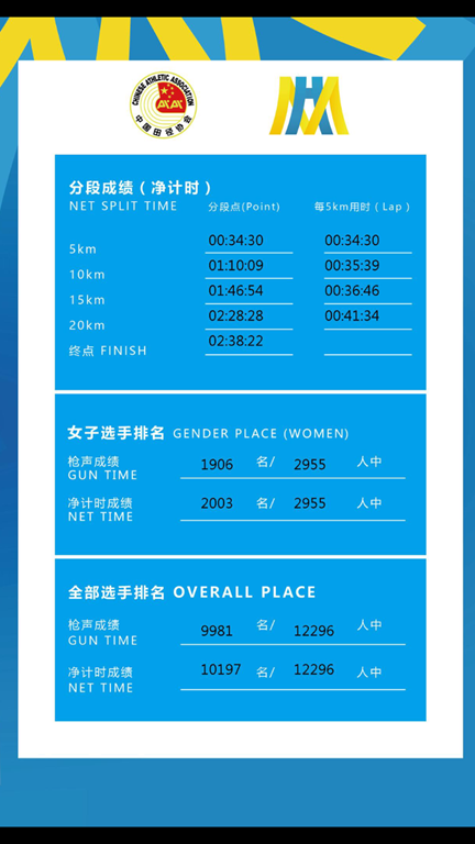 當天有一萬八千多人報名,但從成績單看起來只有一萬三千多人完賽,第一名的黑人選手在我們才跑到6公里的時候已經在對面的15公里處回程了。我原本還野心勃勃想要超越上次金門半馬的紀錄,全身濕透,當然是能完賽就好棒棒了,從8公里開始左右側臀股開始疼痛,15公里時已經到了極限,暖身過頭的下場,要是早上是開車過去報到,少走了那些路,我肯定可以輕輕鬆鬆地跑完~~ (癡人說夢)