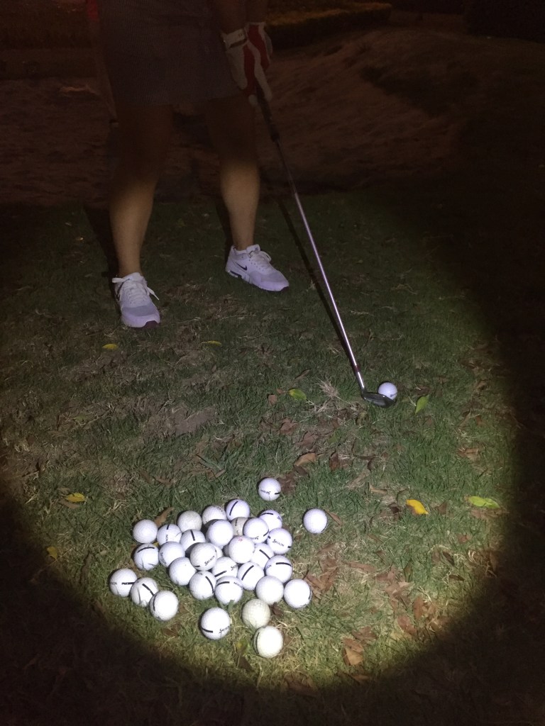 天色漸黑,教練特意帶了手電筒來跟我一起挑燈夜戰,真是辛苦啦!不過我得要好好努力,這兩個角度還沒驗收過關,老是不敢把球打下去,還得繼續加油!