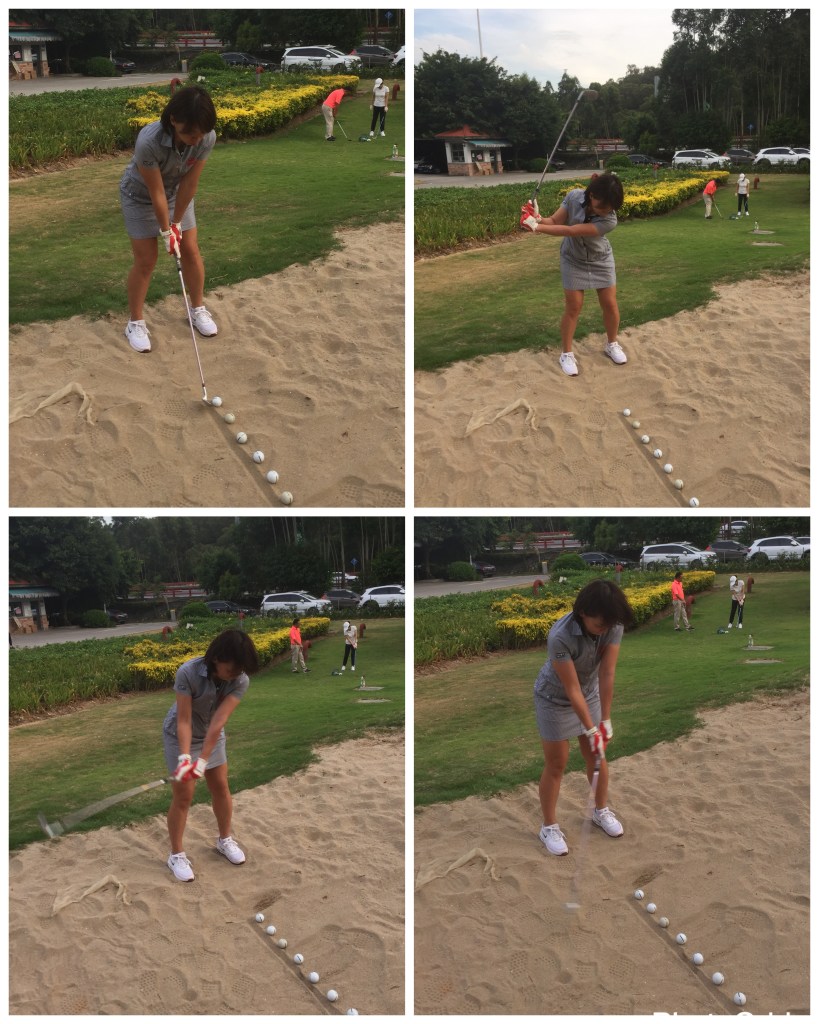 擔心天黑得太快,今天就沒有暖身了,直接開打,教練先用桿子在沙坑上畫一條線,之後再沿著線的左側擺放高爾夫球,線是用來作為瞄準點的,目標是右邊半顆球的位置,朝著沙打下去,打到球也不對,提前挖到沙也不對,技巧是直接曲腕上桿,一樣是靠肩膀轉動,再順勢往下打。正常揮桿手腕是不能有動作的,沙坑就是特例,曲腕的作用就是可以把球從沙坑救出來。一切都是要經過多次的練習,讓身體記住這樣打球的感覺,以後看到沙坑就不用怕了!