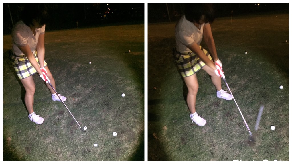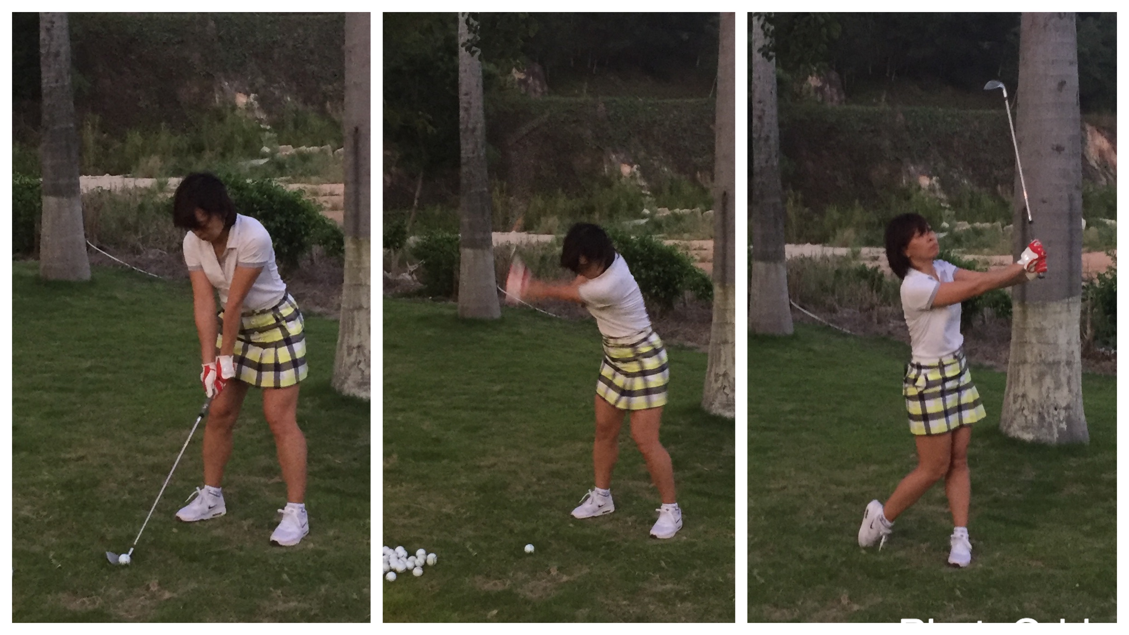 第六堂課,繼續練果嶺邊的切球,今天的重點是10-2點及11-1點,11-1點也就是正常的揮桿動作了,一開始我的球都往右邊去,教練一直強調上桿到頂點(10點或11點方向)後,要停住,手不能晃,然後右手貼著身體右側往下拉,到水平的位置後再把桿子丟出去,記得要翻手到正確的位置,教練會這麼強調當然是我做了卻沒到位,加上老是想看球,所以球不是剃頭,就是往右邊飛去啦!還有個重點是要用鐘擺的自然力量,手不要自己加力道,這樣才能打出穩定的距離。