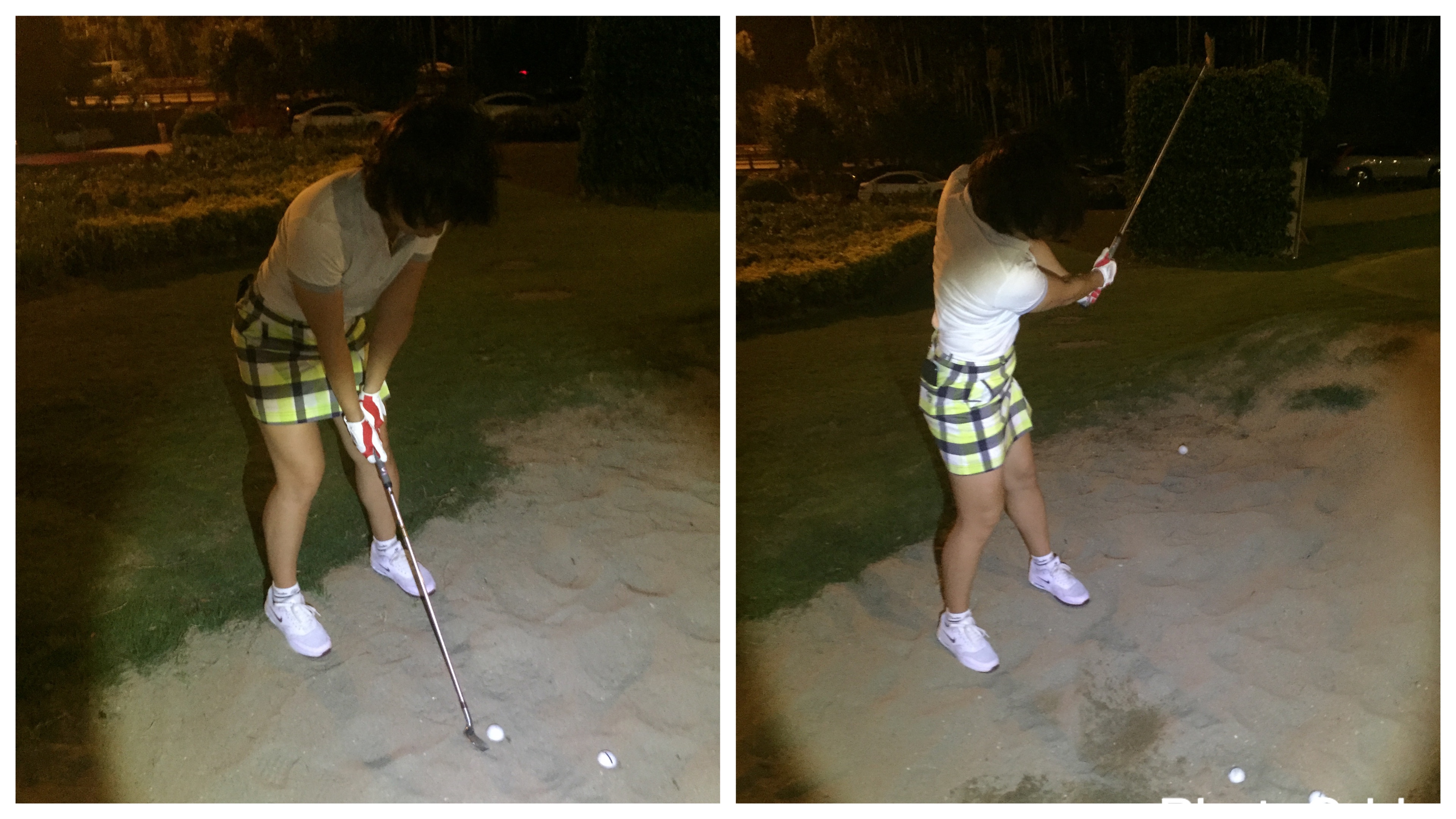 第三個關卡是沙坑的浮蛋球,顧名思義就是已經被沙吃了一半,只剩下半顆露在外面,這種球的技巧是直接曲腕上桿到頂點,然後順勢“往下拉”用力往沙打下去,位置一樣是球的右邊半顆球的位置,然後不用送桿,桿面去擠壓球,球就會彈出去囉!看教練打都很容易,但為啥我的球都飛不起來?常常是下桿位置不對,打到太多沙,要不就是飛得不夠遠,要不就是想把球撈出去,把球撈出去是完全錯誤的行為喔!教練說這些全都是要靠多練習!我心裡想著,下次看到沙坑就閃遠一點,不要打到沙坑去就好!