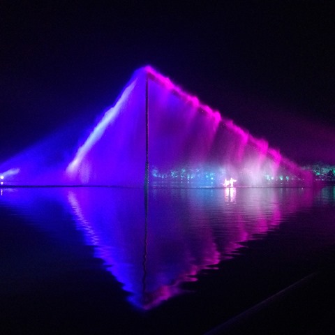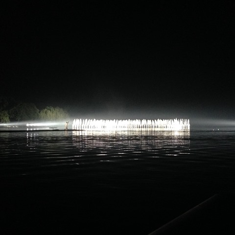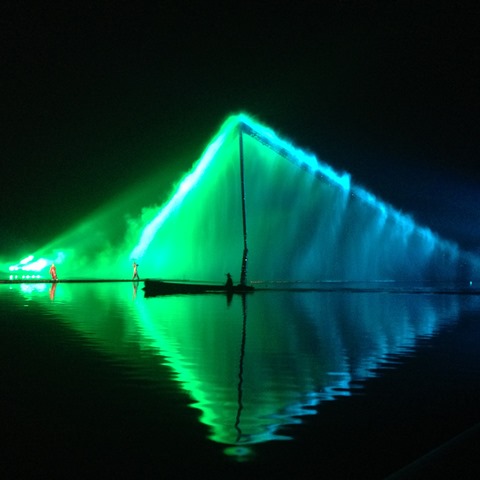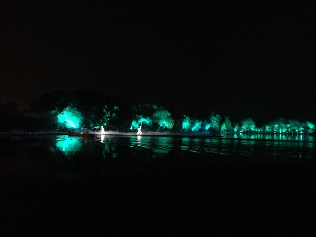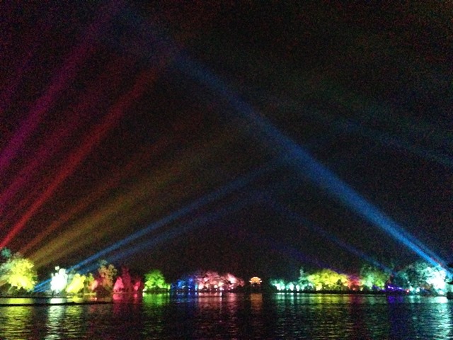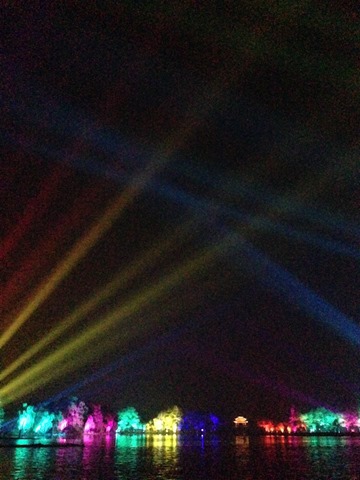 表演一開始,湖邊就閃起各色霓虹,映著湖水,頗為壯觀,據說是演許仙與白蛇的故事。但看起來是男女遇見了之後,談起了戀愛,最後結婚洞房花燭夜的時候,有兩個黑衣人來搶親。跟我印象的白蛇傳不大一樣。