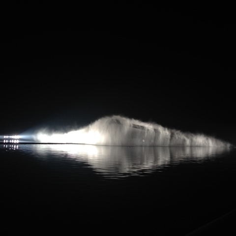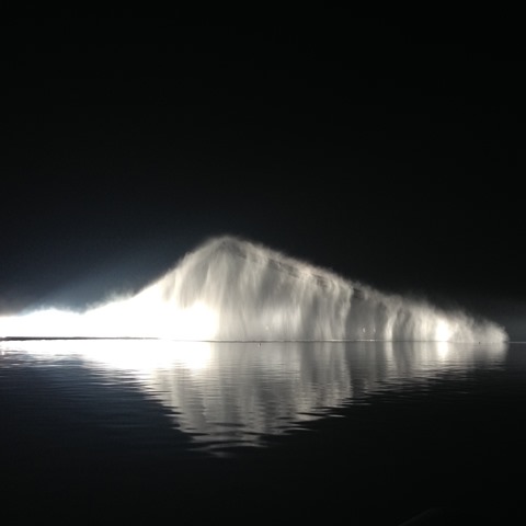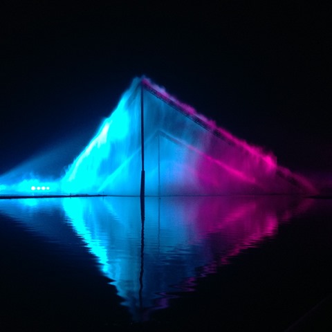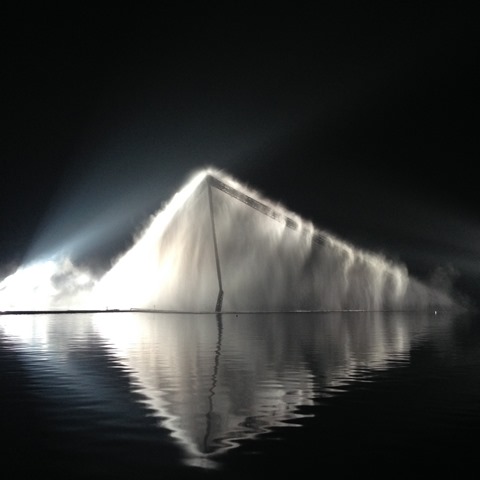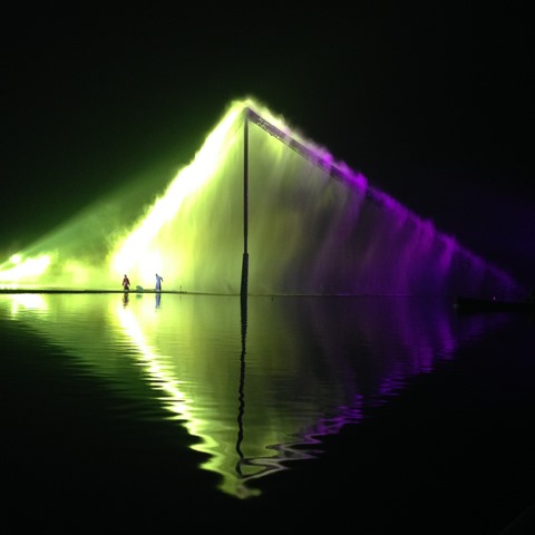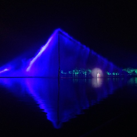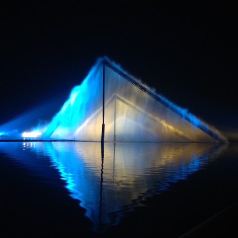 驚喜出現了,水中立起一個三角椎,慢慢變高,一邊噴著乾冰,加上燈光變化,只能說張藝謀真有你的。
