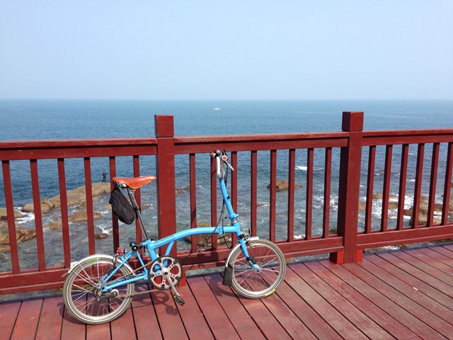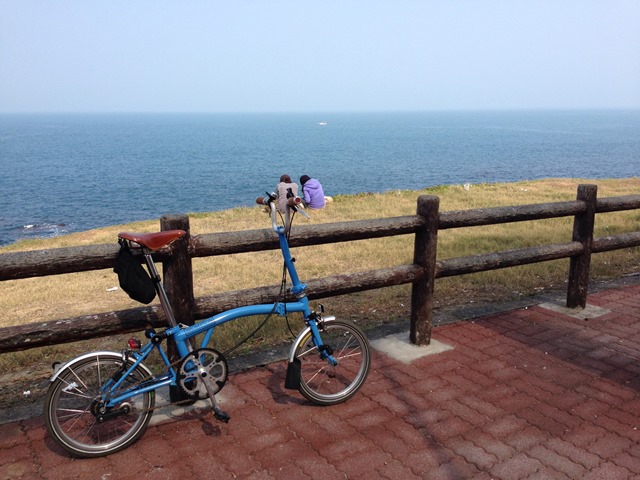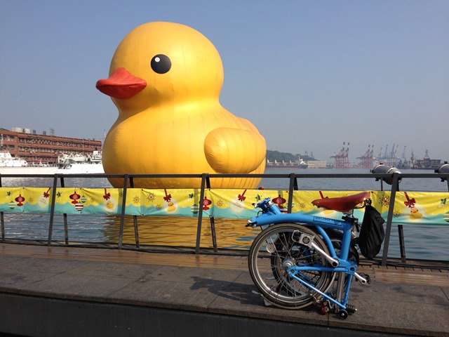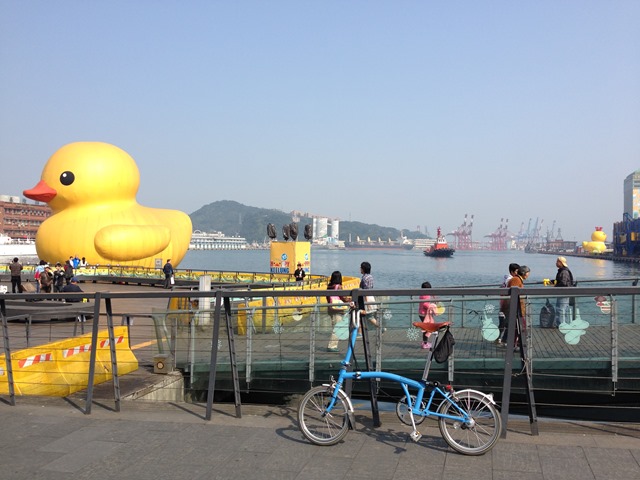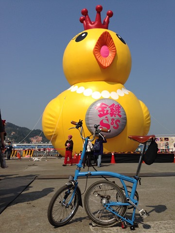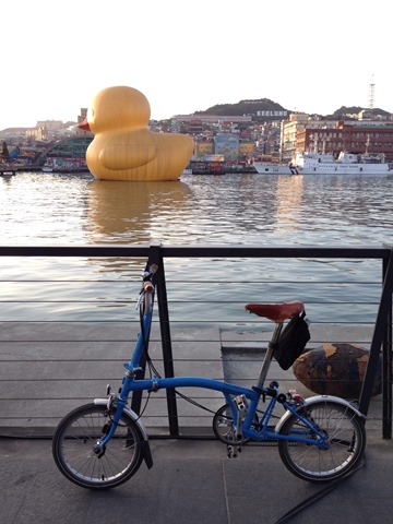 騎著我的小鵝號,不一會兒就到了基隆港邊,因為是除夕的關係,人潮比一般假日少很多,不過竟然有管制腳踏車不能騎上木板地,只好把小鵝號摺起來,才能跟小鴨合照。