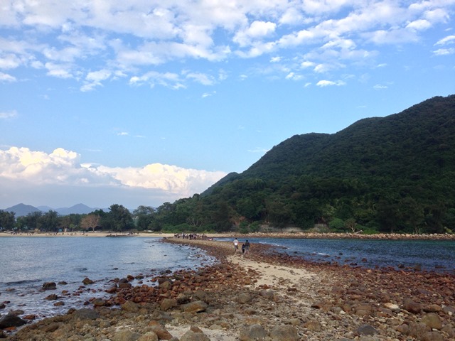 兩邊打過來的浪花,就是那麼剛好,出現一條夠寬敞的石頭路,讓人們可以走到另一座小島上去。