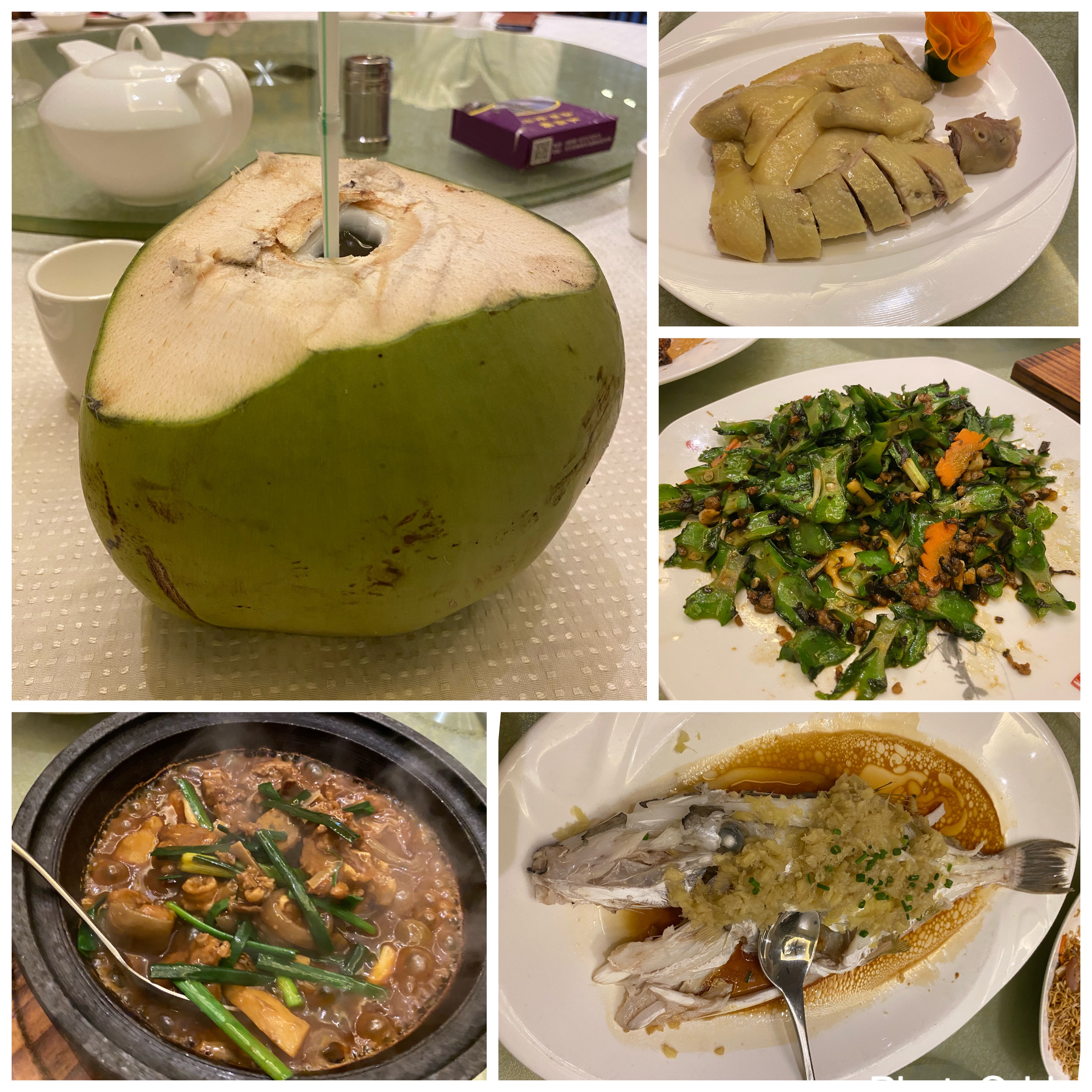 晚上因為聽說商業區很近就決定走路去覓食,但是老人家亂帶路,繞了一大圈,最後找到一家港式餐廳,東山羊肉、扒皮魚、白切文昌雞、欖菜炒四角豆,還有一人一個大椰子!球友說說很難得可以看到還活著的剝皮魚,新鮮的很好吃,所以要特別拍照留念。