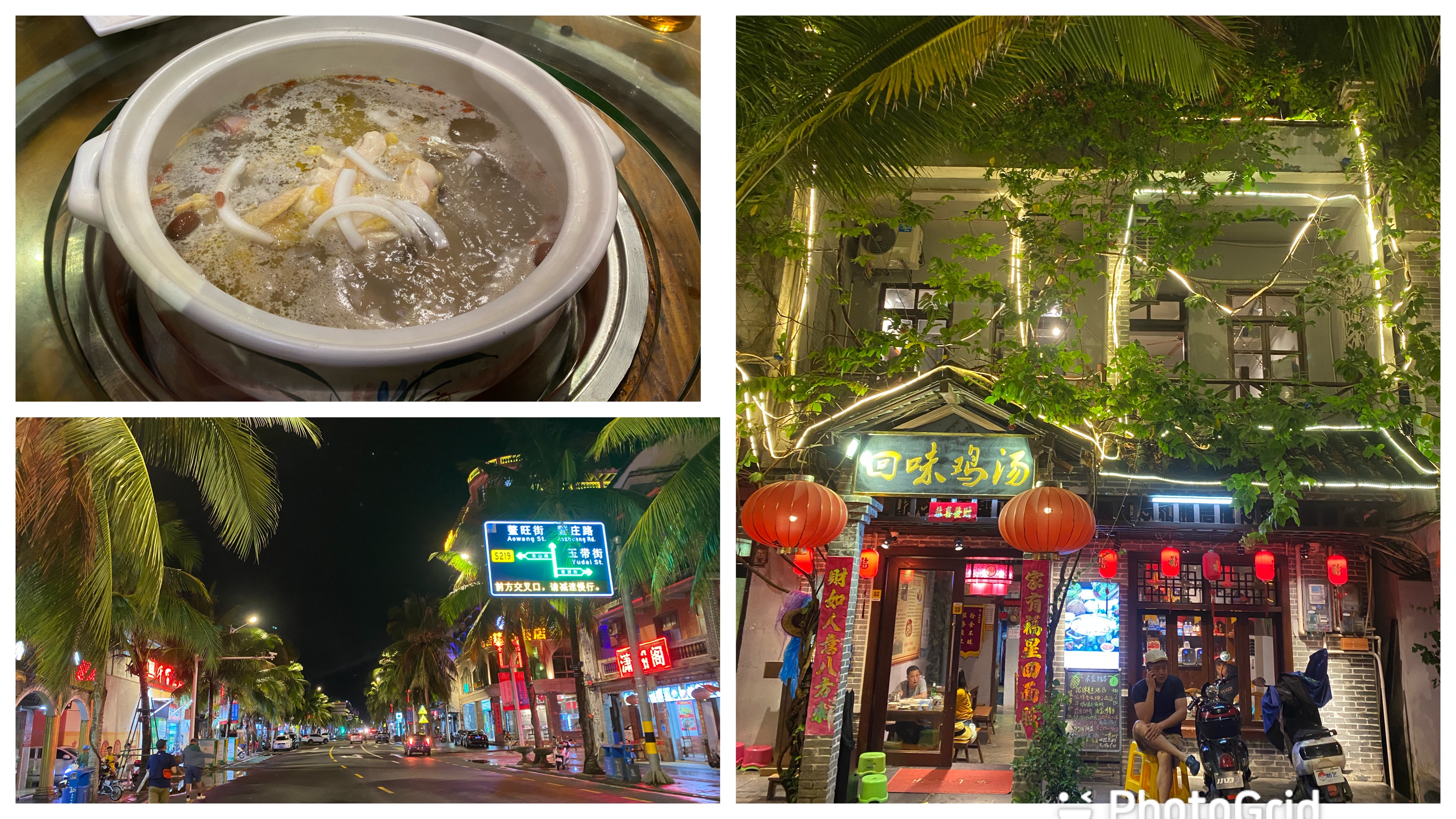 動車抵達博鰲站之後,隨即打車到博鰲東嶼島酒店,稍作休息之後研究好晚餐的選項之後打車去不遠的市區,出發前一天才發現有個颱風要來攪局,大家都擔心得不得了,但是又抱著既來之則安之的心態,總之吉人是有天相的,在博鰲的街上找了一家網紅店吃用文昌雞煮的椰子雞湯,晚上的天氣變得十分涼爽,吃完飯後再沒麼人的街道上散步,順便找便利店買點水跟明天打球喝的飲料,這兒的行道樹是椰子樹,還有蝙蝠飛來飛去,非常特別。